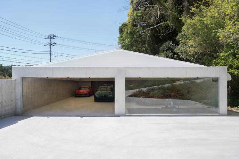 塀と一体化した強固なコンクリート壁で守られたガレージ棟は、ショールームをイメージしてデザインされ、昼間はテント屋根から全面的に自然光が降り注ぎ、夜はランタンのようにほのかに光る。