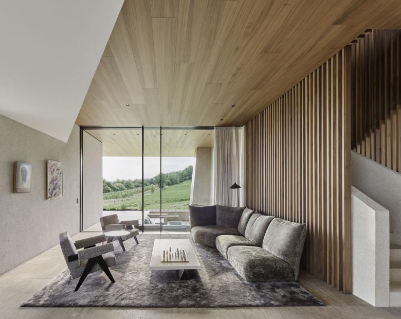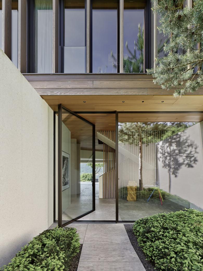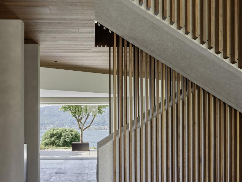 Die Eigentümer und ihre erwachsenen Kinder verbringen viel Zeit miteinander beim Führen eines Familienunternehmens. Daher sollte das Haus einladende, individuelle Rückzugsorte bieten – gleichzeitig aber auch maximale Flexibilität für Gäste, Freizeit und Arbeit. Nahezu jeder Raum im Haus ist auf eine bestimmte Aussicht ausgerichtet – sei es der Yoga-Raum, der sich zum Wald und zur Morgensonne öffnet, oder der Hauptwohnraum, der auf den Bodensee und das schweizerisch-österreichische Alpenpanorama blickt.