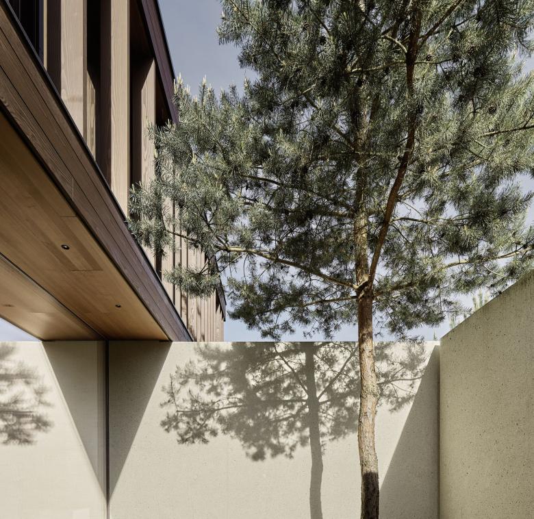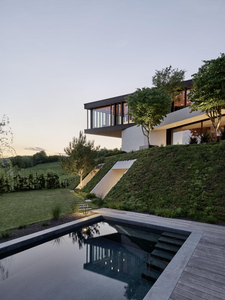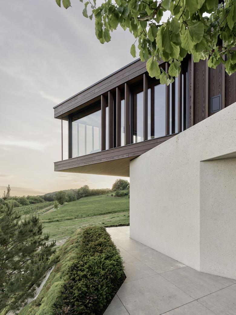 Markante Geometrien, unterschiedliche Maßstäbe und Materialkontraste erzeugen inspirierende Alltagserlebnisse, während die formale Klarheit Raum für Ruhe und Kontemplation lässt. Im obersten Geschoss ruht ein leichtes, mit Holz verkleidetes Volumen auf einem gehämmerten Betonkörper. Das Untergeschoss ist in das Gelände eingelassen und verbirgt unauffällig eine Garage für vier Fahrzeuge.