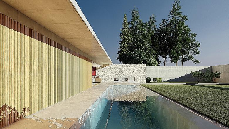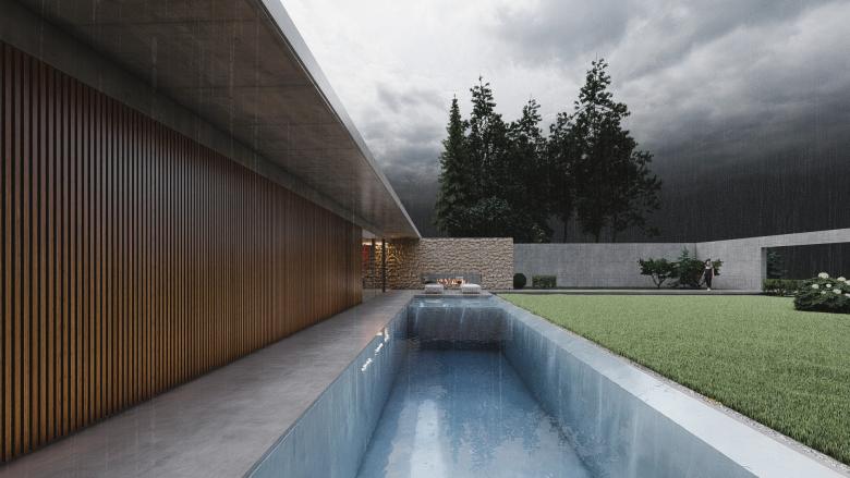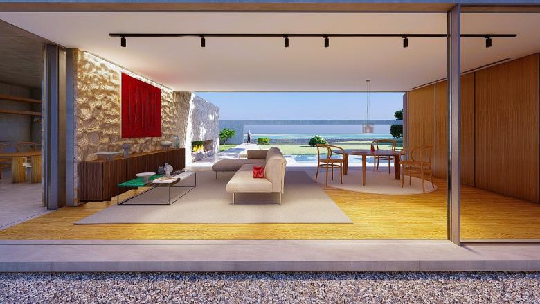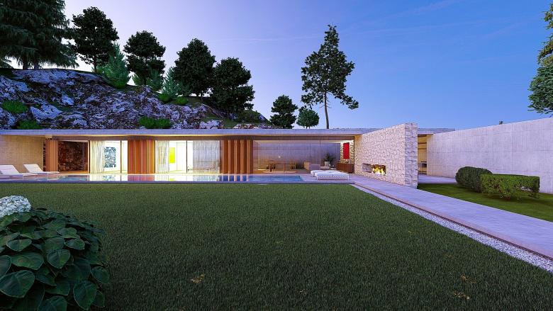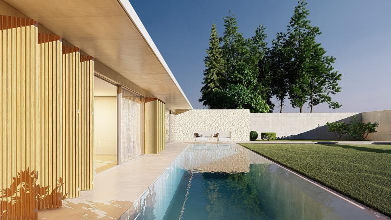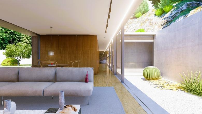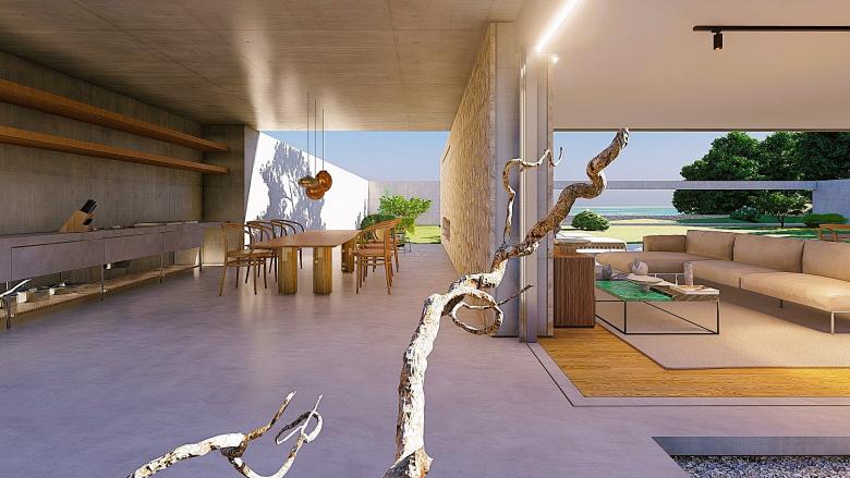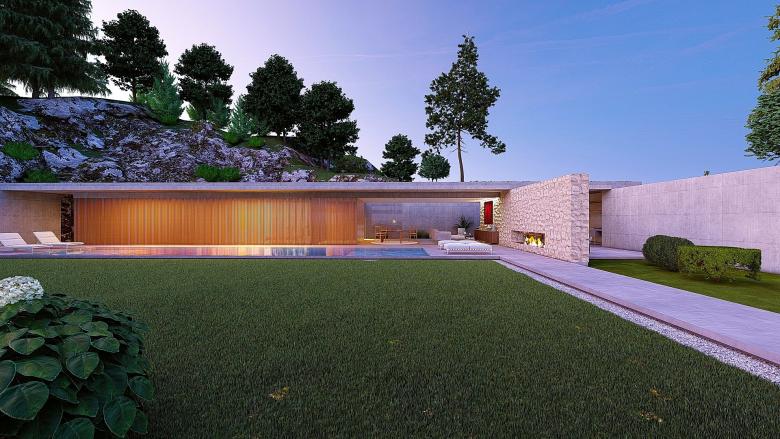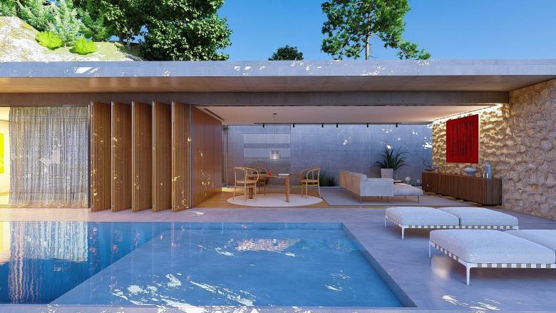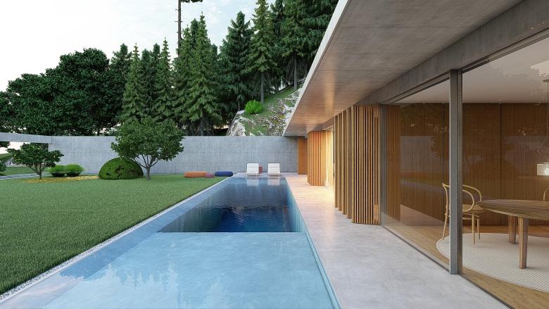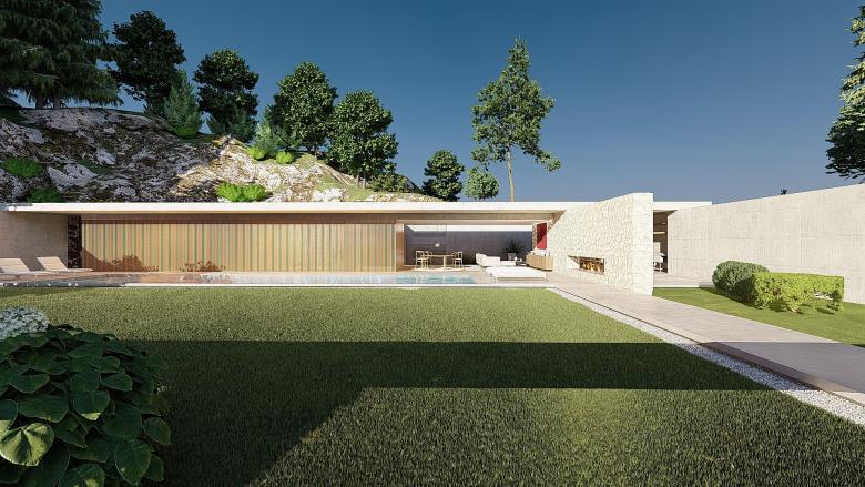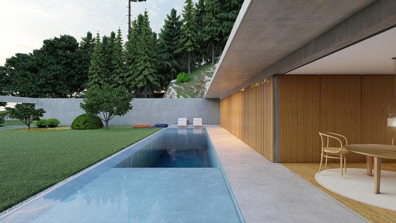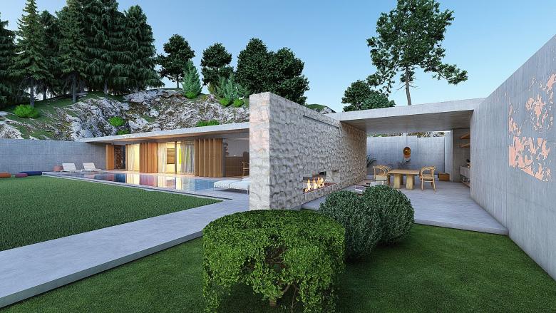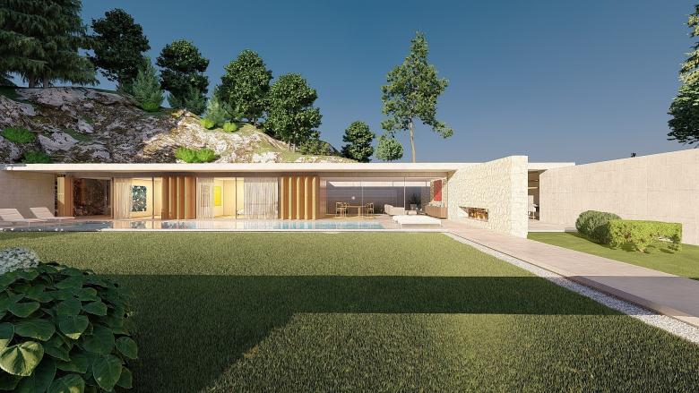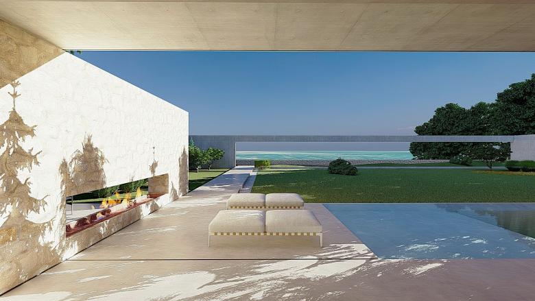 A sense of calm and refinement. A garden frames a place, which becomes sacred through the simplicity of its forms. The villa seems nestled into the mountain; the land, a terrace overlooking the sea, opens up, allowing for a view of infinity. The villa opens to the south, where a pool and garden extend from the interior. Interior and exterior unite and are protected by a concrete blade that appears to rest on the rock, protecting the villa and framing its spaces.