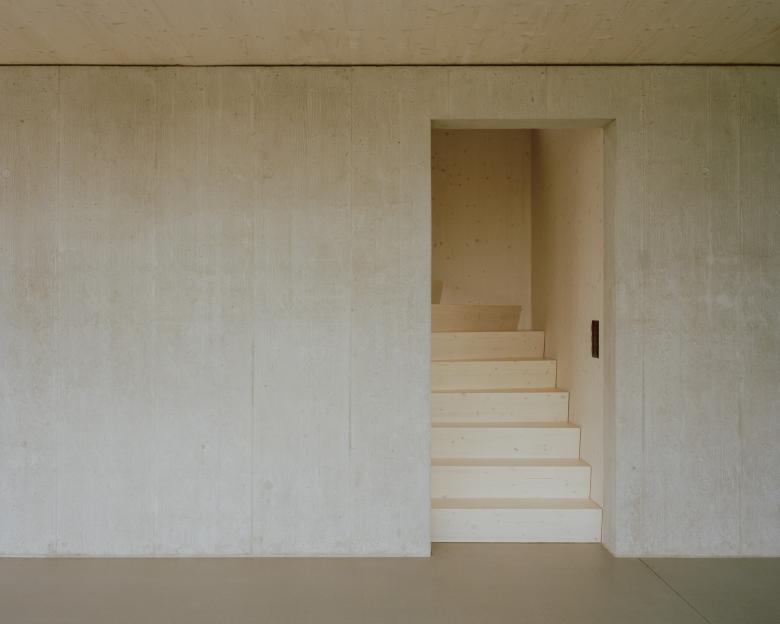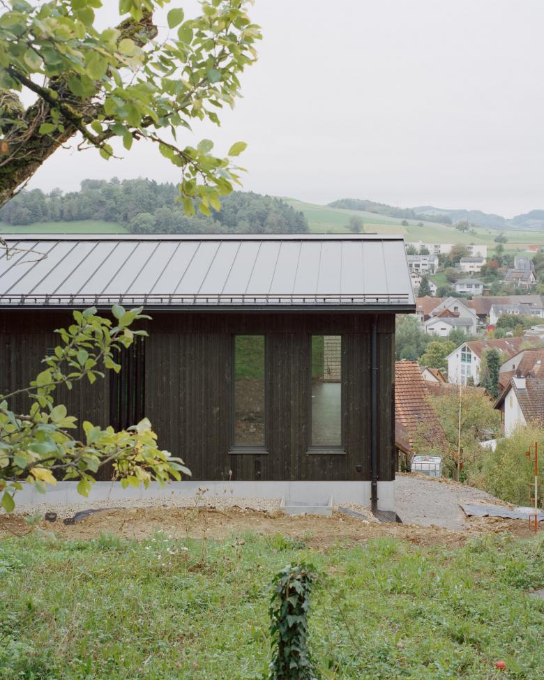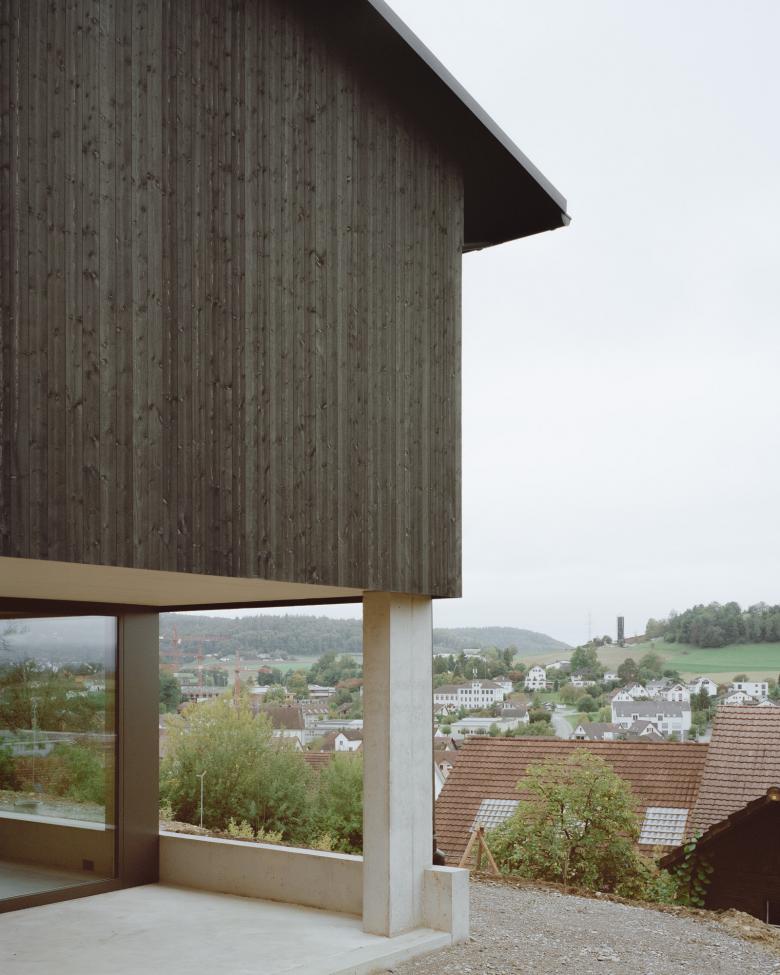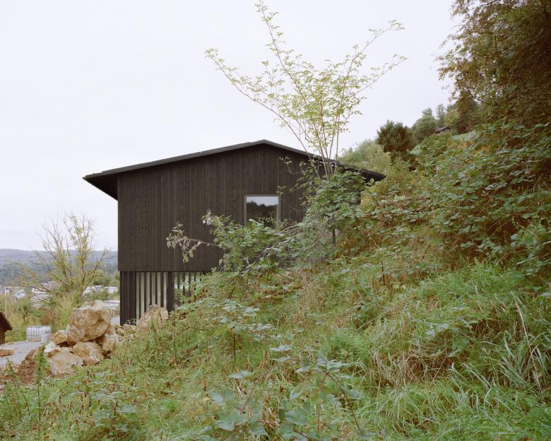 Das Wohnhaus liegt an ausgeprägter Hanglage und fügt sich selbstverständlich in die vorhandene Topografie ein. Die Parzelle befindet sich, trotz starkem Gefälle, in zweiter Bautiefe. Die Lage prägt die Setzung und die Organisation des Hauses.