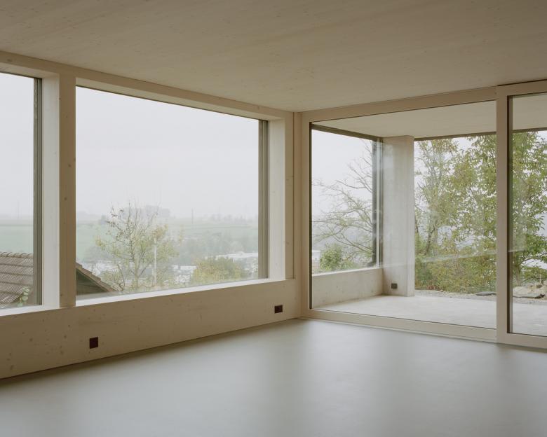 Der zweigeschossige Bau besteht aus einem massiven Sockel und einem darauf gesetzten Holzbau. Die Topografie wird zum ordnenden Prinzip: Eine Wand, parallel zur Hangneigung geführt, teilt das Haus in einen vorderen, zum Tal orientierten Wohnbereich und einen rückwärtigen Teil mit dienenden Räumen wie Eingang, Bädern und Technik.