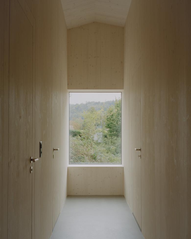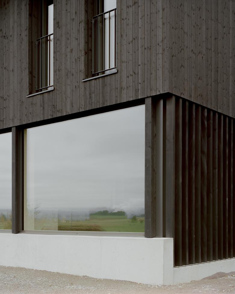 Das hölzerne Kleid ist ruhig gehalten. Farbe, Fenster und Dach bilden eine Einheit. Die Detaillierung ist präzise, auf das Wesentliche reduziert. Das Haus sucht keine formale Geste, sondern findet seine eigene Haltung in der klaren Struktur und der sachlichen Ruhe seiner Materialität und Detaillierung.