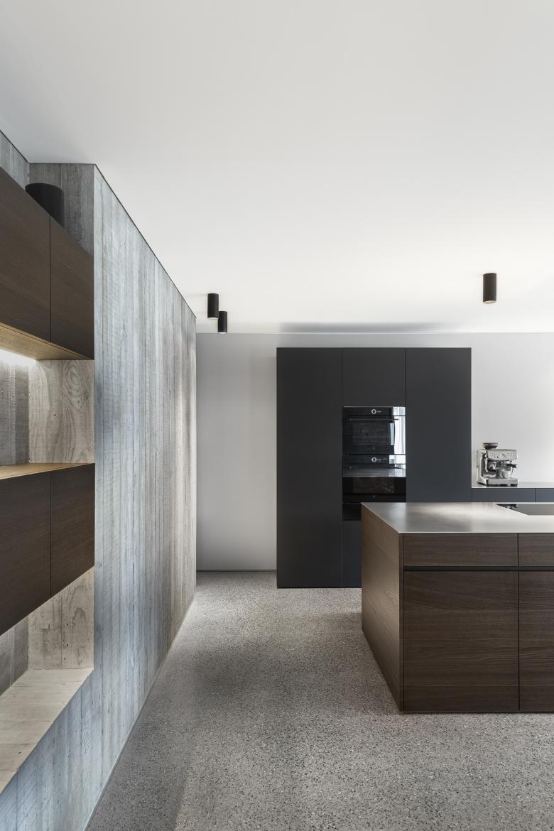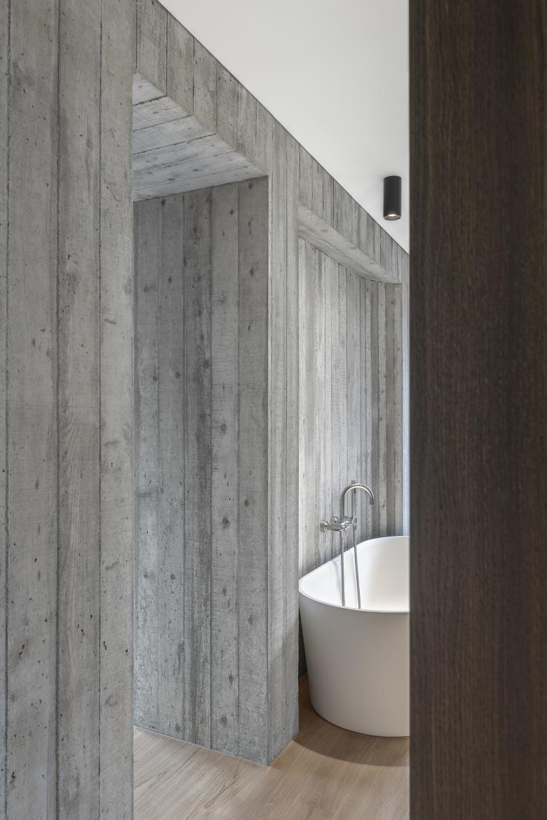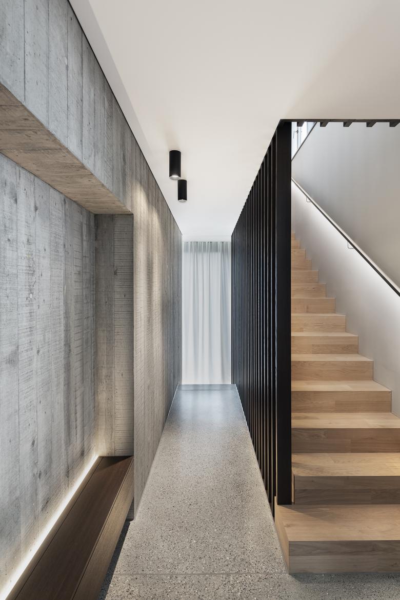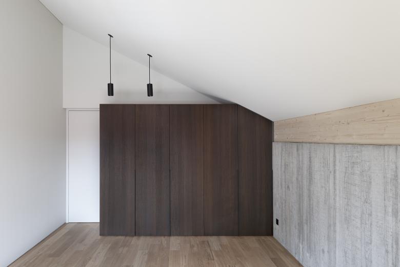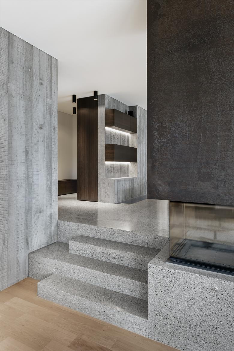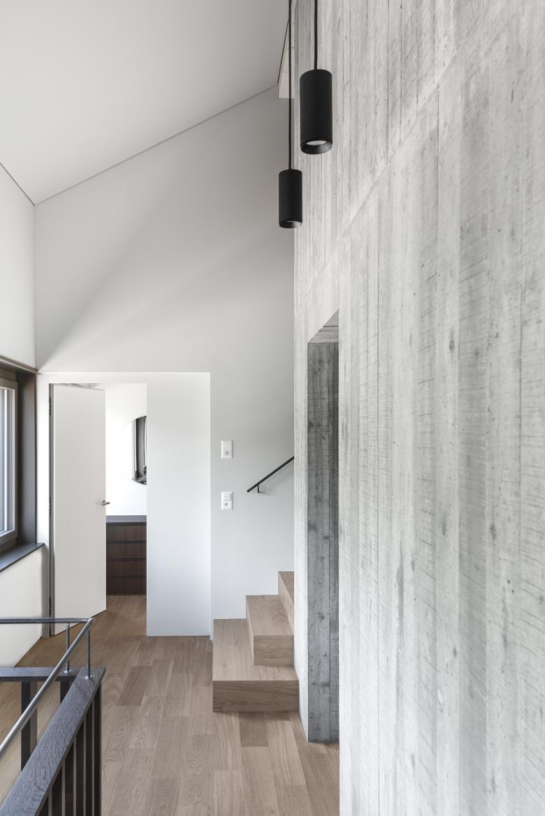 Die beiden Wohnhäuser sind auf unterschiedliche Seiten orientiert: das Osthaus öffnet sich Richtung «Hoher Kasten», das Westhaus Richtung «Kaubad». Im Grundriss der zweigeschossigen Gebäude orientieren sich alle Haupträume nach Süden, während Erschliessungen und Nebenräume entlang der nördlichen Fassade liegen. Im schlichten Innenausbau wurde Sichbeton, Terrazzo- und Eichenparkettböden mit weissen Putzwänden und Einbauten aus dunkel gebeizter Eiche puristisch-elegant verbunden.
