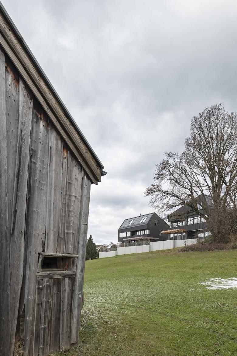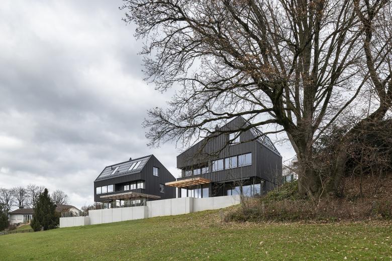 Die zwei Wohnhäuser in einem Einfamilienhausquartier an einem am leicht abfallenden Südhang überblicken das Dorf Appenzell bis hin zum Alpstein. Deren unregelmässige Satteldächer unterstützen sowohl die unterschiedliche Orientierung der Gebäude als auch ihre Individualität. Die einheitliche Fassadengestaltung aus schwarz-braunem Holz verstärkt die Verbindung beider Häuser wieder.