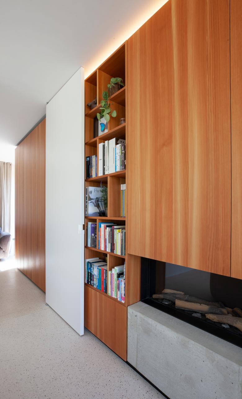 The placement of a carport and entrance on the front façade creates a delayed reveal as visitors approach. The architecture of the entrance zone echoes the funnel concept, guiding guests toward the front door. The claustra in this angled façade is not only an eye-catching feature but also brings natural light down to the basement level, where the parents’ sleeping quarters are located.