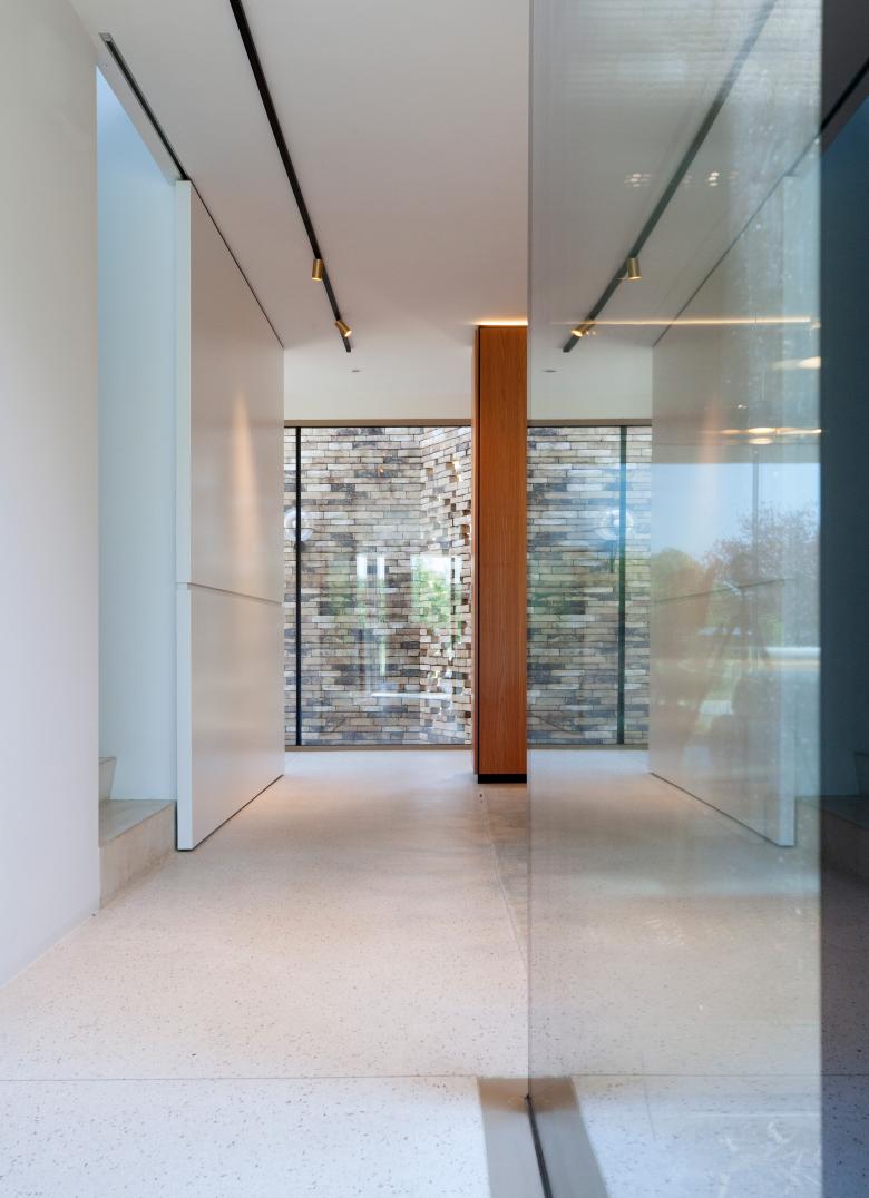 De inplanting van een carport en de inkom in de voorgevel zorgen voor een vertraagd effect in de ontdekkingstocht. De architectuur van de inkomzone herhaalt de trechtergedachte in het begeleiden van bezoekers naar de voordeur. De claustra in deze schuine gevel is niet alleen een eyecatcher, maar brengt ook daglicht naar de kelderverdieping waar de ouders hun nachtvertrekken kregen.