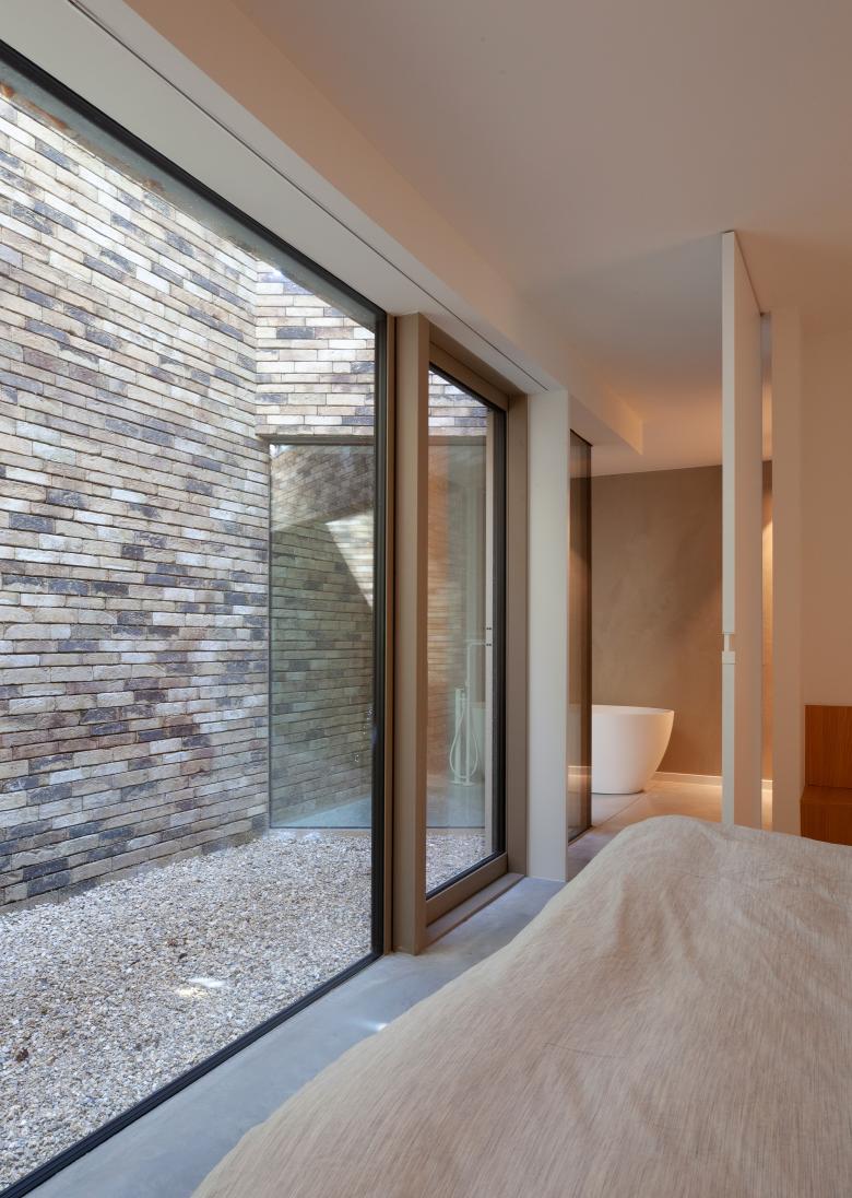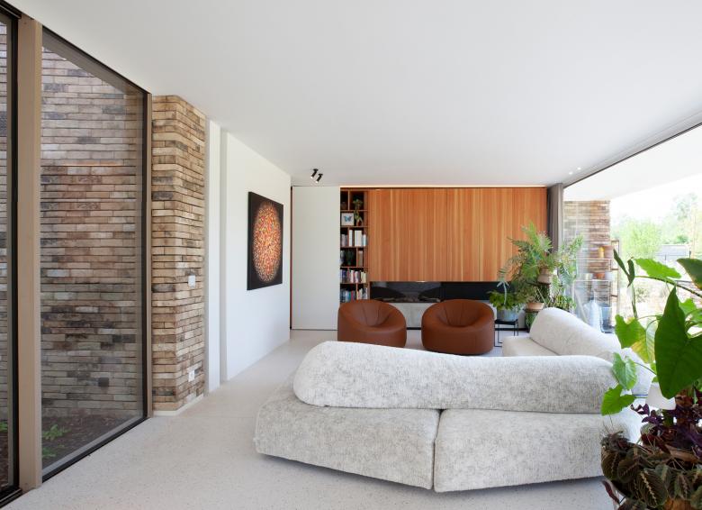 The façade materials achieve cohesion through recurring shades of brown in the masonry and exterior joinery. Glass is minimally framed and cold-bonded to strengthen the connection between inside and outside. A striking feature of the glazing is the window on the upper floor of the front façade, where the glass sharply follows the funnel shape that defines the entrance zone. The glass extends across three floors down to the basement, ensuring a truly distinctive spatial experience.