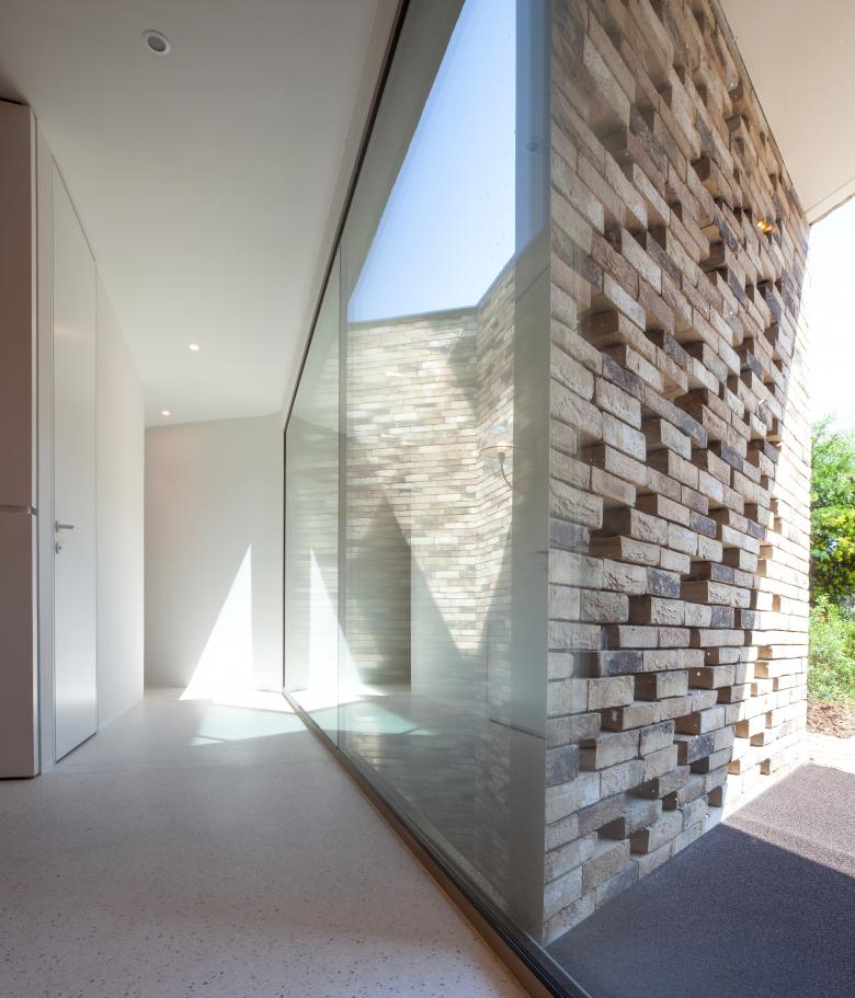 De gevelmaterialen vinden uniformiteit dankzij de terugkerende bruintinten in de gevelsteen en het buitenschrijnwerk. Het glas is maximaal koud verlijmd om de binnen-buiten-relatie te versterken. Een blikvanger in het glaswerk is de raampartij op de verdieping van de voorgevel. Het glas volgt hier in een scherpe hoek de trechtervorm die de inkomzone definieert. Het glasvlak loopt over drie verdiepingen tot op kelderniveau. Een garantie voor een bijzondere beleving.