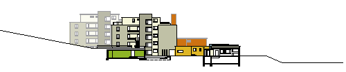 Der kubische Charakter der vorgefundenen Architektur wird durch das Farbkonzept verstärkt zum Ausdruck gebracht. Bis zu vier unterschiedliche, warme Grautöne verdeutlichen die volumetrische Komposition der Wohngebäude, welche sich ansonsten optisch ruhig im Hintergrund halten.