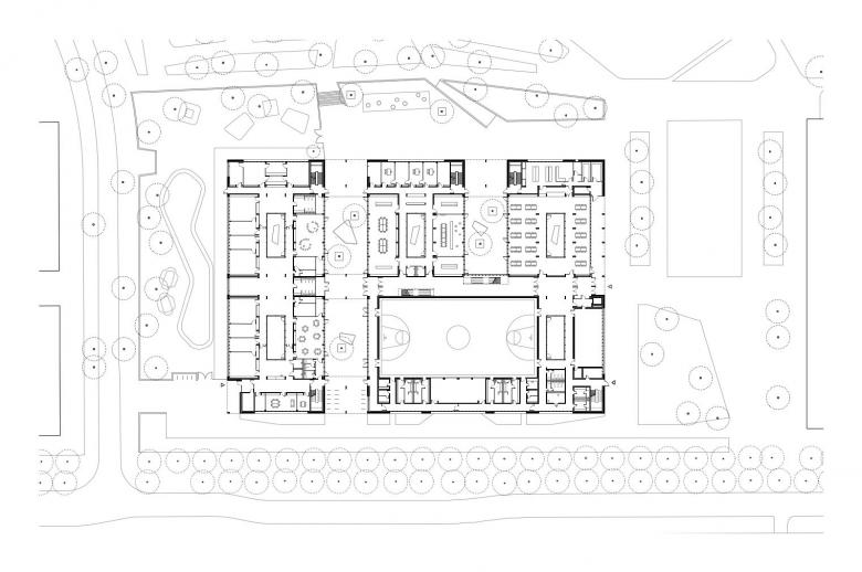 Schule und Kindertagesstätte sind zu einem Baukörper zusammengefügt, jedoch auch eigenständig ablesbar. Durch die ebenengleiche Anordnung aller Klassen wird der Austausch der Schüler zwischen den Jahrgangsstufen und so das Lernen von- und miteinander gefördert. Die Klassenräume öffnen sich zu den pädagogisch vielfältig nutzbaren, räumlich differenzierten Lernzonen. So entstehen unterschiedliche Bereiche, die selbstorganisierten, offenen wie auch abgeschlossenen Wissenserwerb, Lernen und Arbeiten alleine oder in der Gruppe ermöglicht. Die Gruppenräume der Kindertagesstätte sind L-förmig um zwei Lichthöfe angeordnet und zu den zugehörigen vorgelagerten Freiräumen orientiert.