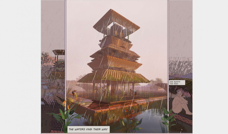 The Water Temple celebrates the hydrological process through the deification of water and religious architecture. It proposes a renaturalization strategy that increases urban permeability by using natural micro-catchments, thus mitigating urban flooding. These micro-catchments are presented in architectural forms of temples that are able to clearly display their function within the environment. The temple is a hydrophilic structure that collects filters, and stores rainwater. The water passes through a series of mushroom-like containers that filter water by holding natural coarse and fine aggregates. This transparency and display of the hydrological process informs the community and allows them to participate in the process of hydrological restoration.
