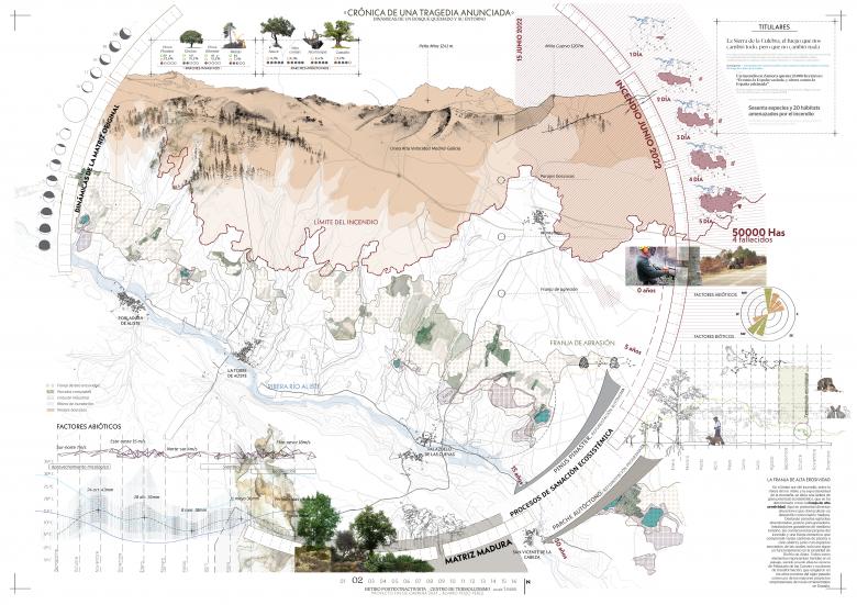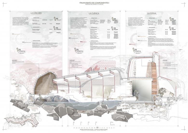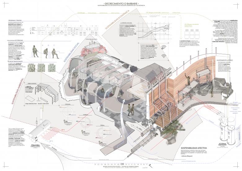 The current consumption model is outdated, and architecture reflects this crisis. This project, driven by degrowth principles, reimagines construction practices to foster healthier, regenerative spaces. Through the case study of a thermal leisure center in an abandoned slate quarry in Sierra de la Culebra, a prototype of degrowth strategy for architecture is developed. After a devastating wildfire in 2022 ravaged the region’s biodiversity, deep-rooted issues were laid bare: depopulation, climate change, and an outdated economic model driven by uncontrolled resource extraction.