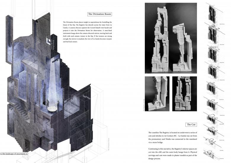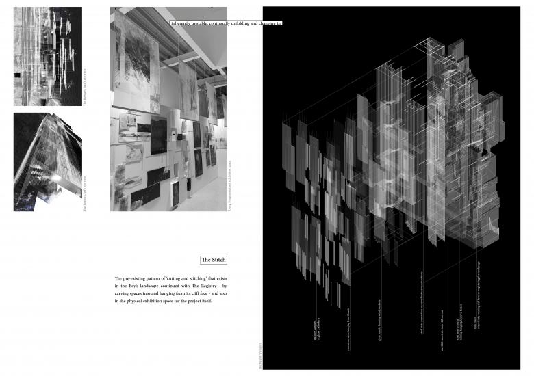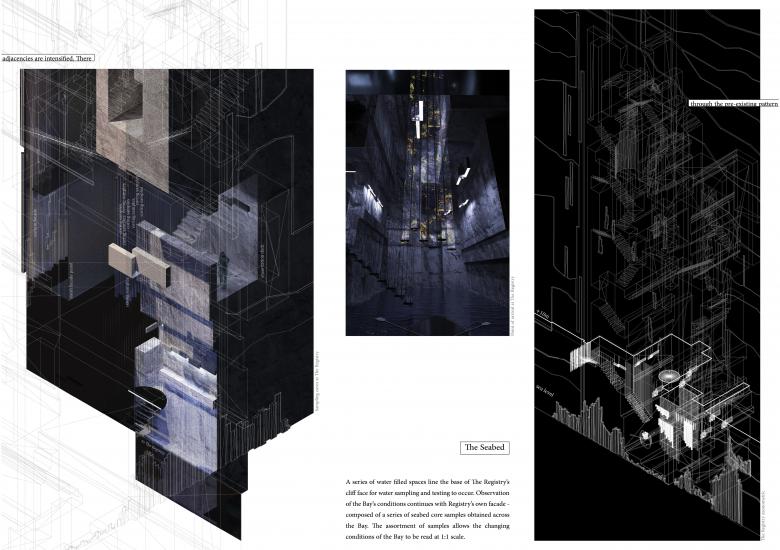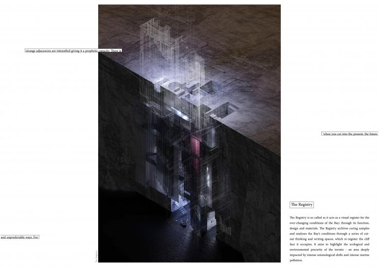 The project’s architectural intervention, The Registry, actively engages with the Bay’s past, present and future water conditions. It archives coring samples and analyses the Bay’s conditions through a series of cut-out thinking and writing spaces - whilst re-registering the cliff face it occupies. It aims to highlight the ecological and environmental precarity of the terrain - an area deeply impacted by intense seismological shifts and intense marine pollution.