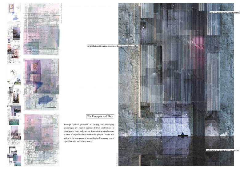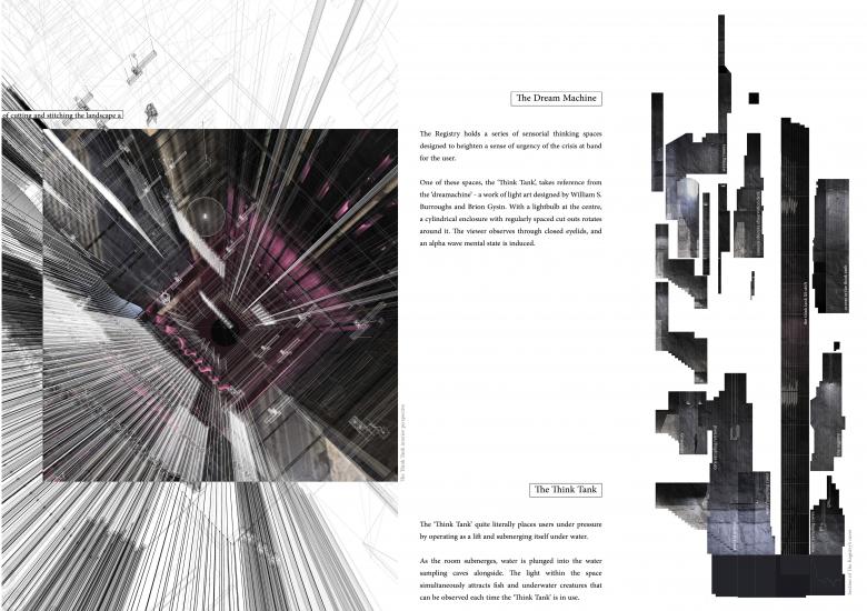 Burroughs’ 'cut-up' technique extends to both the architectural and programmatic development of the overall project. Through his cut-up experiments, Burroughs came to believe that ‘when you cut into the present, the future leaks out’ – giving the methodology a prophetic capacity. The methodology aims to circumscribe an architecture that mediates different natural, temporal, and ecological settings.