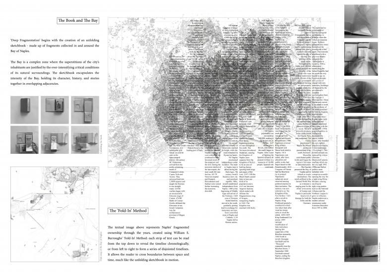 ‘Deep Fragmentation’ as a methodology was developed through a range of experimental design and research techniques, taking inspiration from a wide range of sources. It focuses on a non-linear way of working. Through cyclical processes of cutting and overlaying, assemblages are created forming abstract explorations of place, space, time, and journey. These shifting visuals create a sense of unpredictability within the project, which is incredibly apt for Naples, a city on edge.