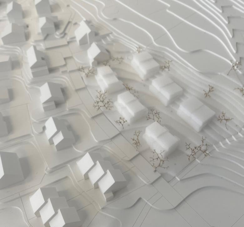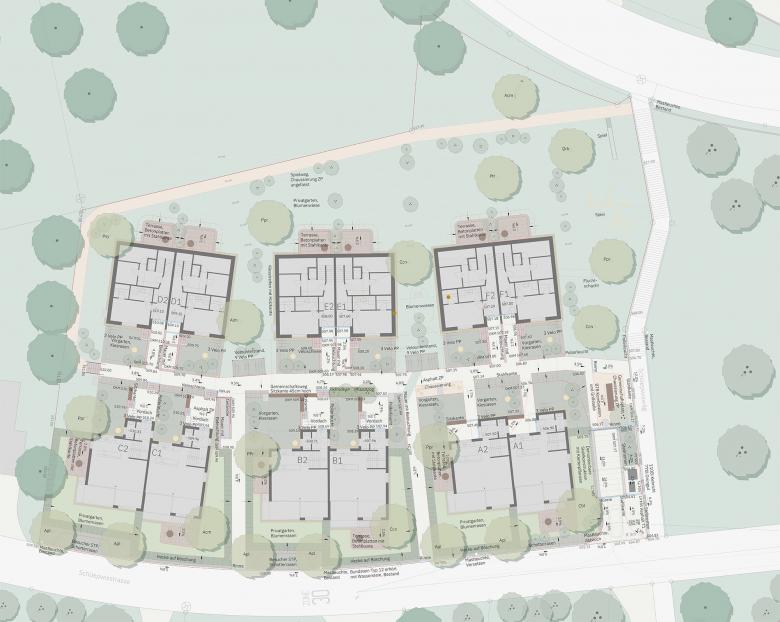 Um der umgebenden, eher kleinteiligen Gebäudekörnung zu entsprechen, operieren wir mit sechs sich auch typologisch optimal einfügenden Doppeleinfamilienhäusern. Zwei nahezu parallel zur Strasse liegende Häuserreihen generieren einen Zwischenraum, der den Siedlungsraum und die Adresse bildet. Zur Strasse schliessen quartiertypische Privatgärten den privaten vom öffentlichen Raum ab. Zwischen den Häusern verlaufen die Siedlungszugänge. Der halböffentliche, innere Erschliessungsraum bildet das Herz der Anlage. Hier liegen die Hauseingänge mit den vorgelagerten Aussenräumen. Begegnungen zwischen den Bewohner*innen können hier stattfinden. Die Überbauung besteht aus zwei 5.5.- Zimmer Haustypen. Die Wohnhäuser sind gut besonnt und dreiseitig orientiert. Die Wohnräume sind O/W- und O/S/W – orientiert und haben direkten Zugang zu den privaten Aussenräumen. Neben den gedeckten Loggien und Dachterrassen verfügen alle Einheiten über Aussensitzplätze, sowohl zum gemeinschaftlich genutzten inneren Siedlungsraum als auch, eher privat, zum eigenen Garten. Die Gemeinschaft fördernde Aussenräume werden im autofreien Siedlungsraum angeboten.