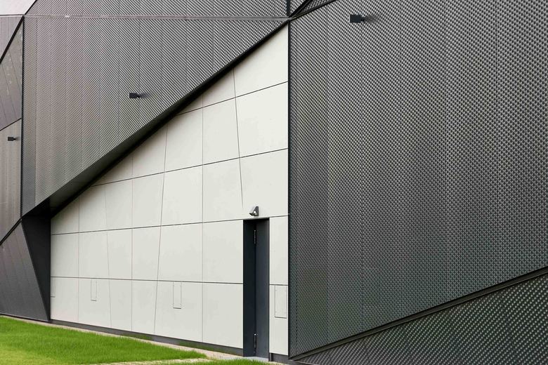 Als weiteres originäres Gestaltungsmerkmal ist die semitransparente Hülle in triangulierte Facetten aufgebrochen, die die orthogonalen Grundkörper dreidimensional gefaltet umspielen. Die im Gebäudevolumen nicht differenzierte Modularität der Datenhallen wird durch eine Rhythmisierung der Hülle mit Facetten, die über den Sockel bis auf den Boden gehen, ablesbar.