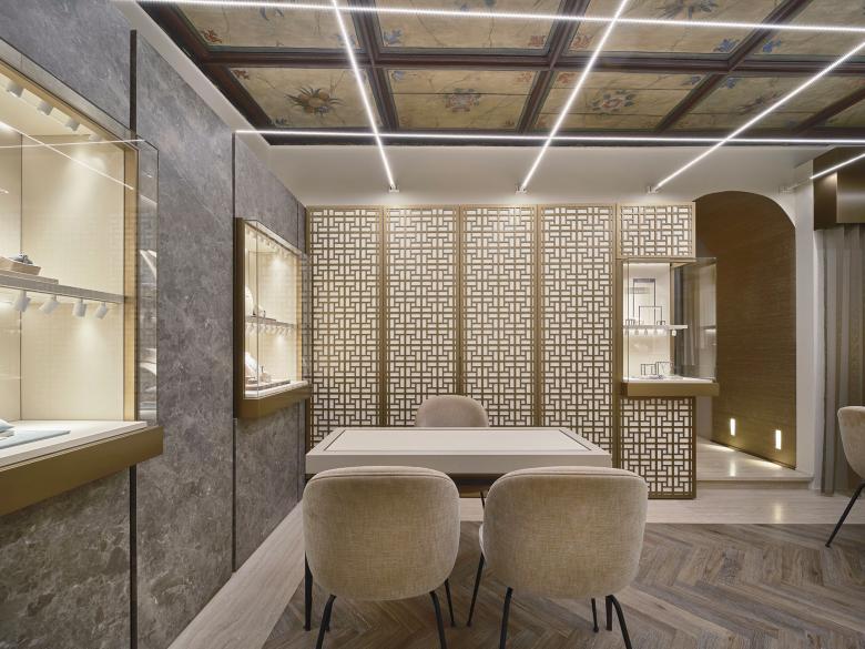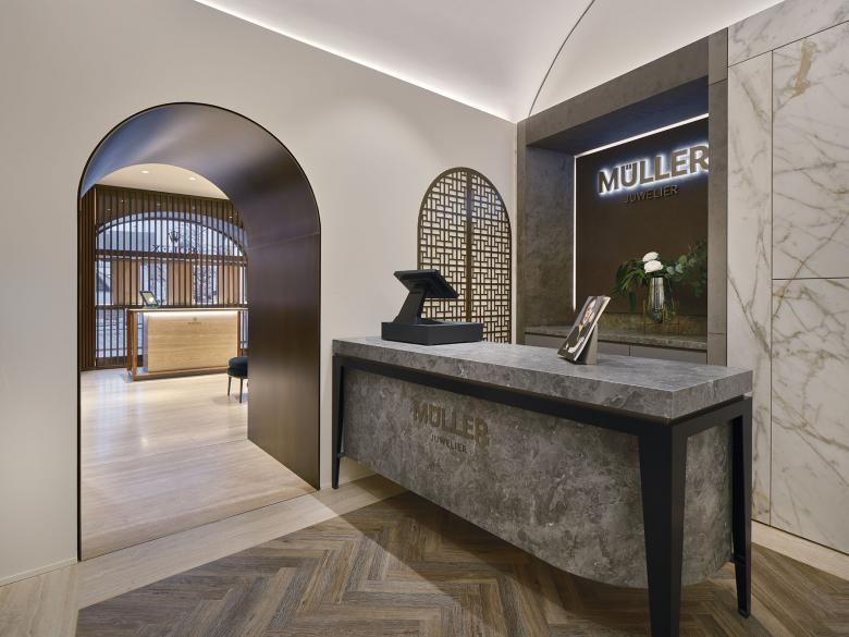 Die hochwertigen Marazzi-Fliesen im Grande-Stone-Look, die teilweise gewölbeartigen Raumdecken und die kleinen, teils tunnelartigen Raumübergänge vermitteln ein Gefühl wie in einem römischen Badehaus – mit kleinen Bereichen zum Verweilen. Die nach hinten hin dunkler werdende Raumatmosphäre erzeugt eine fast geheimnisvolle Stimmung und schenkt den Kundinnen und Kunden, insbesondere im wohnlichen Barbereich, eine ganz eigene Atmosphäre. Die gewählten Materialien in Bronze-Optik, die samtigen Bezugsstoffe sowie die hochwertigen Steinoberflächen, kombiniert mit den edlen Bodensegmenten in Holzoptik, verleihen Juwelier Müller die Einzigartigkeit und Exklusivität, die sowohl den Produkten als auch den Kundinnen und Kunden gerecht werden.