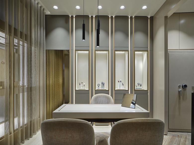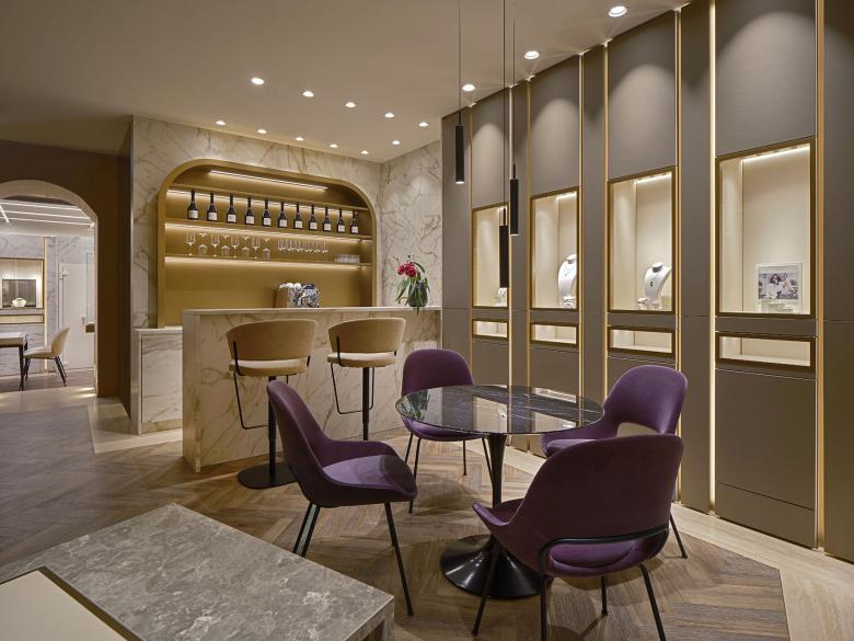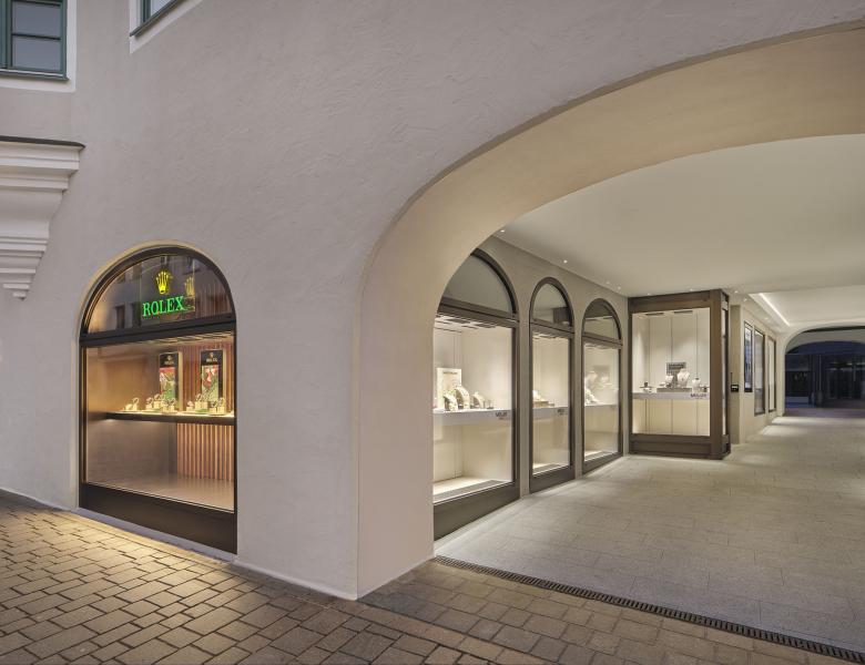 Im ersten Bauabschnitt wurde in einer Umbauzeit von knapp fünf Monaten das erste Gebäude mit seinen vier Verkaufsräumen umgestaltet und umgebaut. Altes Inventar musste zunächst demontiert werden, um die Substanz des historischen Gebäudes begutachten zu können. Besondere Herausforderungen bestanden – neben der Gebäudesubstanz, den Auflagen durch den Denkmalschutz und dem erforderlichen Brandschutzkonzept – darin, dass die etwa 90 m² großen, ineinander übergehenden Verkaufsräume wenig Fenster haben. Es galt also, eine Lösung zu finden, die Kundinnen und Kunden einlädt, die Verkaufsräume zu entdecken und dort zu verweilen. Das Raumkonzept musste es schaffen, jeder Produktgruppe einen eigenen Auftritt auf ihrer eigenen kleinen Bühne zu ermöglichen und dabei einen harmonischen Übergang zwischen den Räumen zu schaffen. So auch im zweiten Bauabschnitt, in dem innerhalb von drei Monaten ein 30 m² großer Uhrenbereich entstand, der das Gesamtkonzept abrundet – und das alles ohne einen einzigen Tag Schließung.