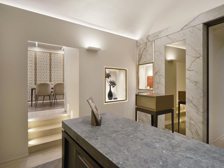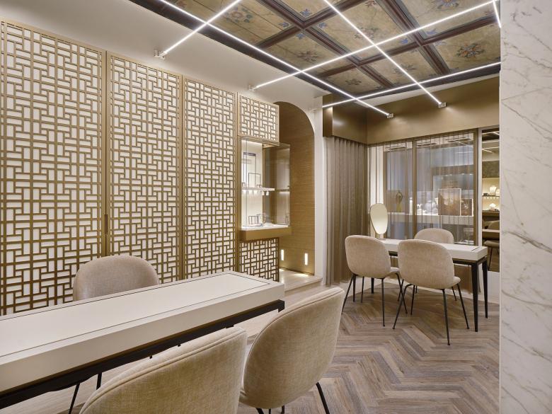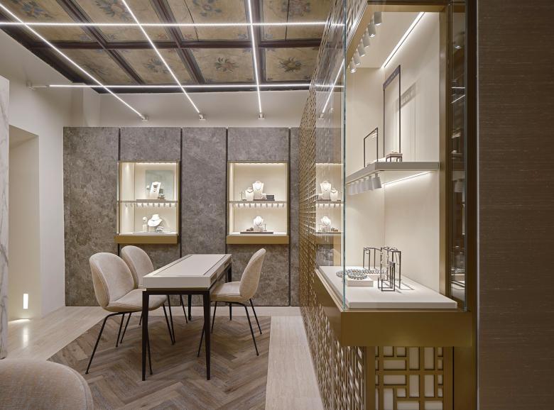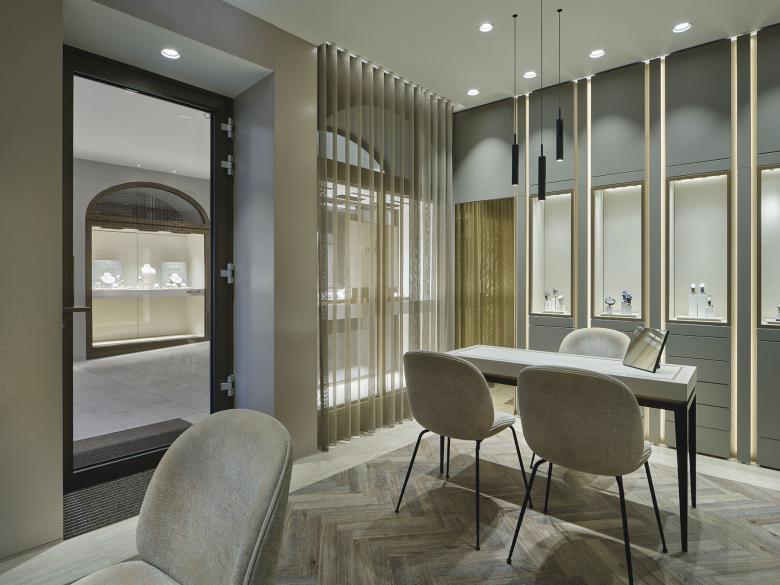 Ein gekonntes Zusammenspiel von Farben, Materialien und Licht war und ist die Lösung – schlichte Eleganz in zeitloser Form im historischen Kontext. Dabei kamen keine standardisierten Ladenbausysteme zum Einsatz. HEIKAUS plante individuell und der Schreiner fertigte exklusiv. Jeder Bereich erhielt ein auf den Raum und die präsentierten Produkte zugeschnittenes Beleuchtungs- und Farbkonzept. Dadurch wurde die Segmentierung der Räume noch verstärkt – durch die kassettenartige Verlegung des hochwertigen Fischgrätparketts in heller Holzoptik, jeweils gerahmt von römischem Travertin.