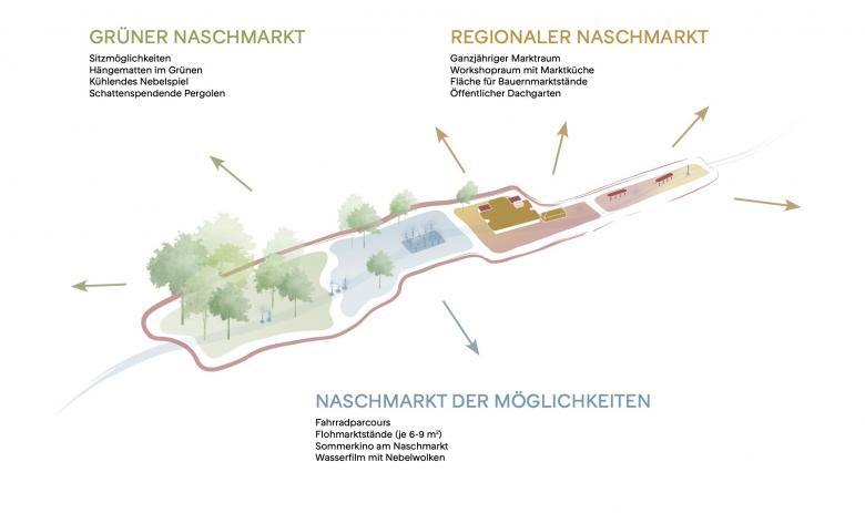 Landschaftsplanung und Thomas de Martin entwickelt – ausgezeichnet mit dem 1. Preis im EU-weiten Wettbewerb. Gemeinsam entstand eine Vision, die Architektur und Freiraum untrennbar denkt: der Marktraum als sozialer Mittelpunkt, der Naschpark als grüne Lunge und klimatische Ressource für die Nachbarschaft.