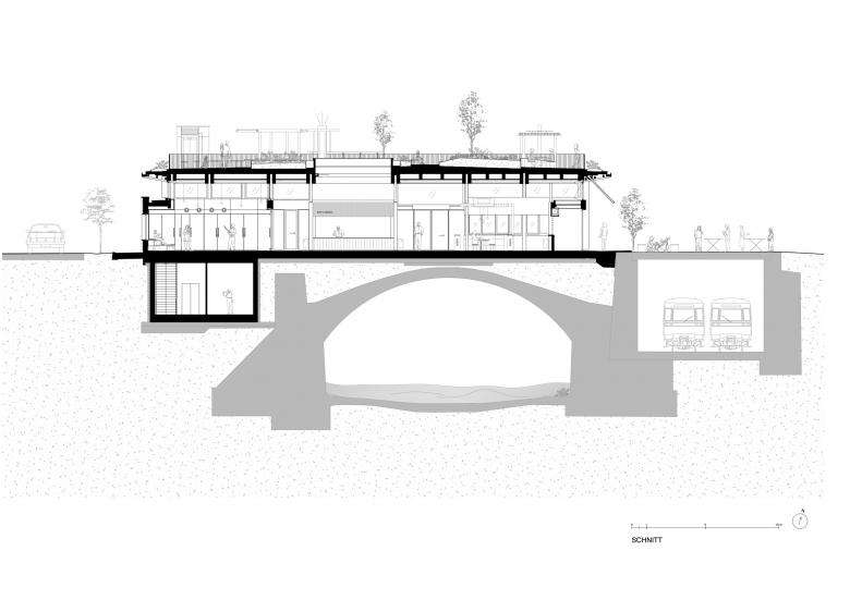 Als hybrider Leichtbau ruht der Marktraum auf schlanken Stützen über dem Wienflussgewölbe. Das Tragwerk ermöglicht größtmögliche Offenheit und Flexibilität, während ein Untergeschoss als Technikraum dient, um die knappe Erdgeschossfläche optimal zu nutzen. Die Fassade aus grün lasierter Lärche verankert das Gebäude im Ort und greift das charakteristische