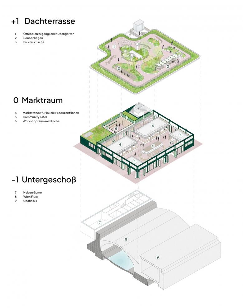 Der Marktraum bildet das neue Entrée des Naschmarkts und setzt zugleich ein Zeichen für eine zeitgemäße Marktkultur. Er ist als überdachte Fortführung des Bauernmarkts gedacht – ein Ort, der den Handel mit regionalen Lebensmitteln stärkt und den Produzent:innen Wiens ein dauerhaftes, wetterunabhängiges Zuhause gibt. Zugleich vermittelt der Bau räumlich wie visuell zwischen dem