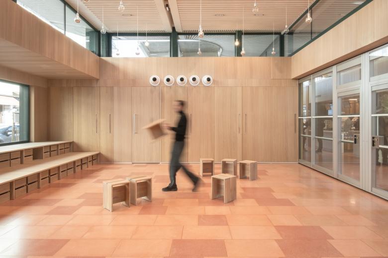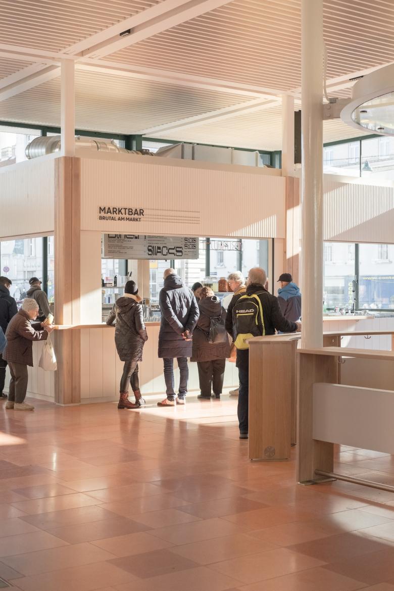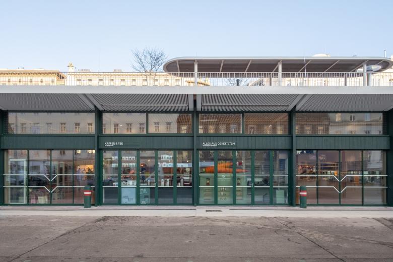 Farbspektrum des Naschmarkts auf. Im Inneren schaffen hell geölte Eichenoberflächen Wärme und Helligkeit, während der durchgehende Terrazzoboden in changierenden Rosétönen – gefertigt von der österreichischen Firma Gierer – innen und außen verbindet und die Idee eines durchgehenden Raumes unter einem offenen Dach betont. Die großflächig öffenbaren Fassaden und ein zentraler öffentlicher Durchgang machen das