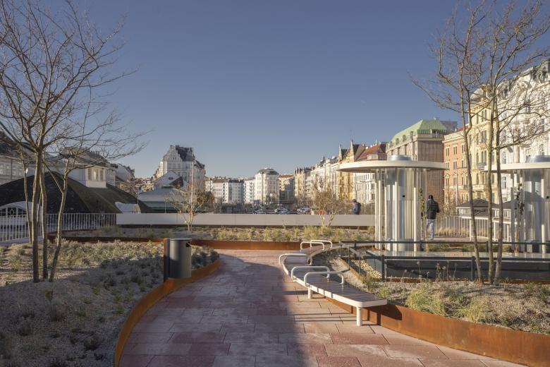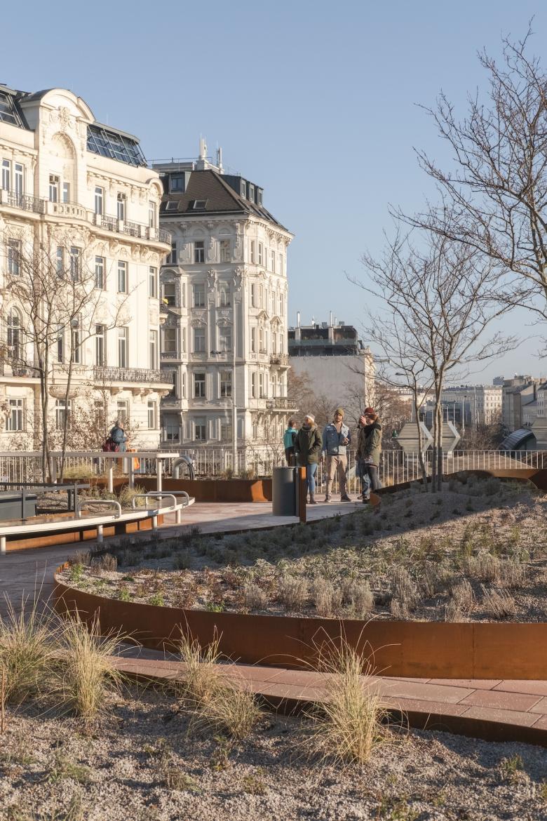 Über dem Marktraum öffnet sich eine begrünte, öffentlich zugängliche Dachterrasse – ein konsumfreier Treffpunkt und neuer Stadtbalkon. Zwischen Grüninseln und Stauden entsteht ein Ort der Wissensvermittlung und des Verweilens. Von hier aus bietet sich ein weiter Blick über das Wienzeilenensemble, die Otto-Wagner-Häuser, den Markt und den neuen Naschpark.