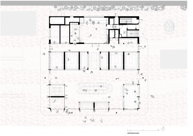 Die Freiflächen rund um den Marktraum – der ehemalige Mottomarkt und der neue Vorplatz – bieten Raum für saisonale Märkte, gemeinsames Kochen und Nachbarschaftsfeste. Der Marktraum bildet dabei das Herzstück: ein Ort, von dem aus das Marktgeschehen, das Lernen und das Feiern