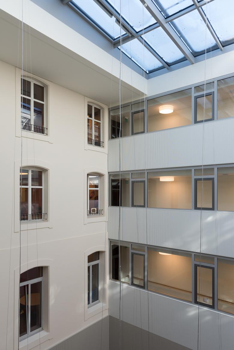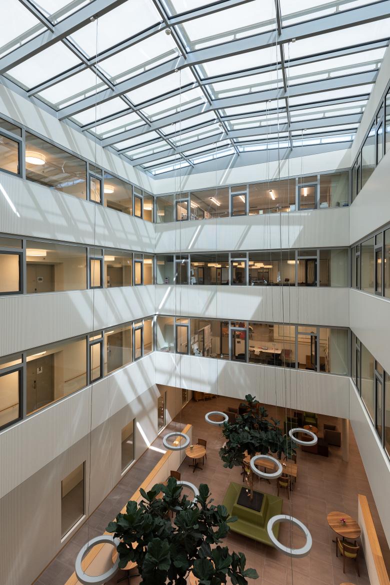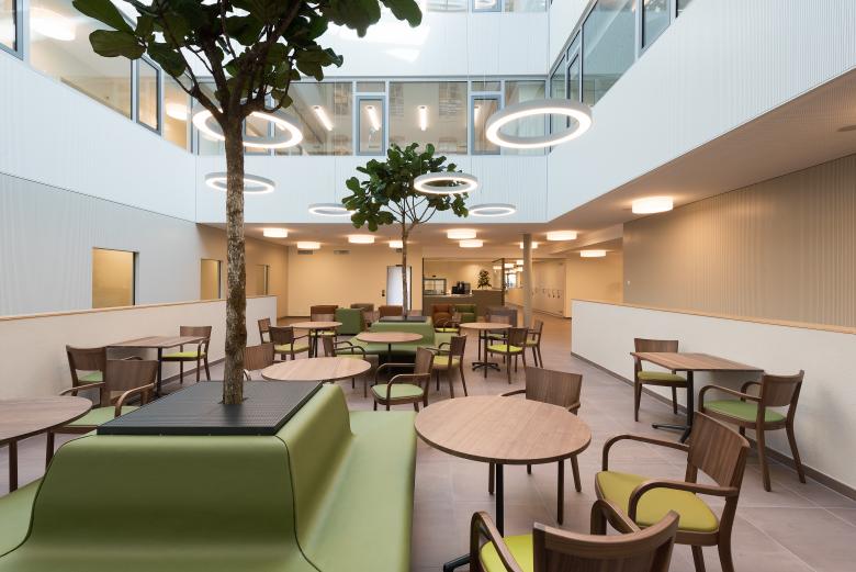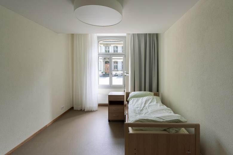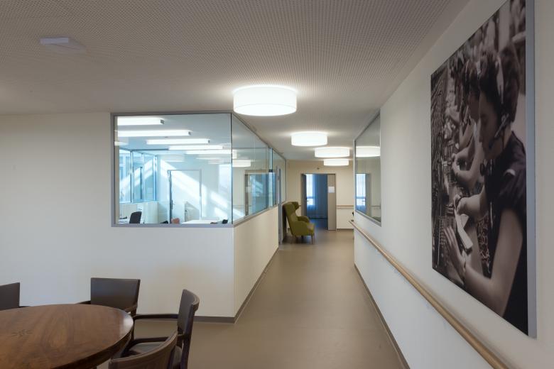 Auf drei Ebenen wurden die Zimmer im Altbau mit dem Neubau zu Wohngruppen mit je 25 Betten erweitert und durch einen Rundgang verbunden. Dadurch entstand eine neue betriebliche Einheit. Verschiedene Rundwege mit unterschiedlichen Sitznischen und eine Achterschlaufe auf den Wohngeschossen verbinden die Aufenthalts- und Essbereiche. Das Stationsbüro mit Sichtkontakt in die Wohn- und Aufenhaltsbereiche ist zentral angeordnet. Der überdachte Innenhof dient als fixer Orientierungspunkt zwischen dem Alt- und Neubau.