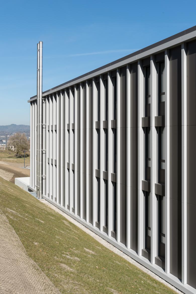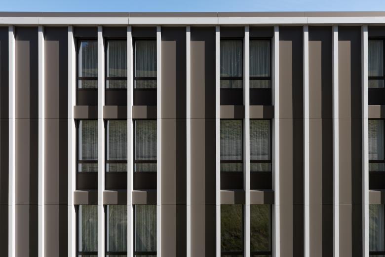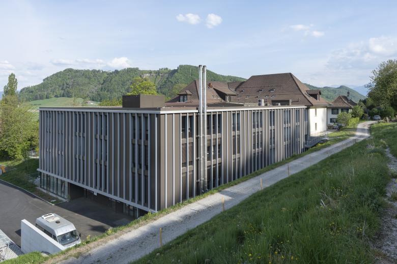 Das Gebäude wurde auf die historisch relevanten Bauteile reduziert und um einen L-förmigen Ergänzungsbau erweitert. Dieser schliesst unterhalb der Traufe fassadenbündig an den Altbau an und wird integraler Teil des bestehenden Gebäudes. Neben dem massiven Altbau mit seinen Lochfenstern erhält der Neubau eine klar strukturierte Fassade. Aussenliegende vertikale Lisenen verleihen dem Neubau einen ruhigen, je nach Blickwinkel geschlossenen oder gar offen wirkenden Ausdruck. Der Neubau wird Teil des Altbaus, grenzt sich aber visuell ab und besticht durch seine Eigenständigkeit. Das Demenzzentrum ist eingebettet in eine grosszügige Aussenanlage, die sich im Landschaftspark der historischen Campagne forsetzt.
