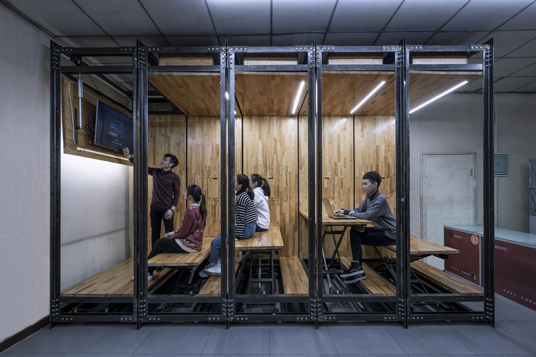 9.639平米,这是比一间普通卧室还小的面积数。它也可以是:12个工位的办公桌台,18人的会议室,28人观看的小型展厅;集成了办公、会议、交流、展示、电路、灯光、储物需求。同时也可是一个微型展览空间,一个阶梯沙龙交流空间;它是一个小建筑、一个大家具、一个大电器。