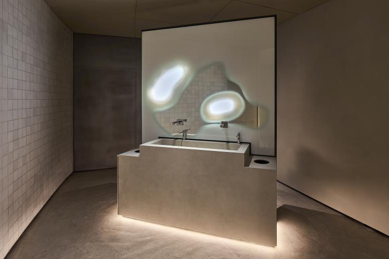 For the washrooms, we divided the space diagonally with free-standing vanities in order to provide privacy while avoiding additional airlocks. The vanity mirrors, produced locally, combine a complex of translucent, reflective, and matt surfaces within a single pane, developed through a painstaking prototyping process.