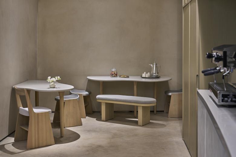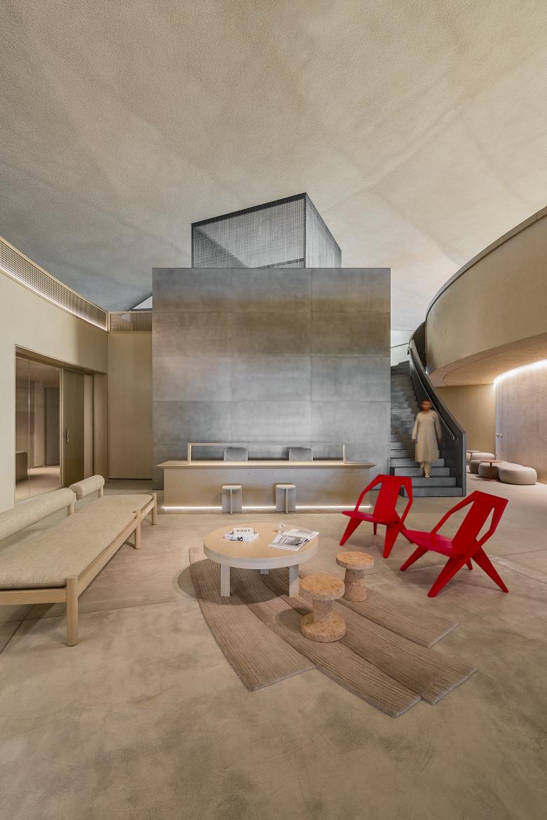 The palette of materials was developed in harmony with the branding, stressing the creational power of words, symbolically expressed through red accents against neutral shades of paper and sand. We used contrasting materials: rough plaster, widespread in traditional architecture, and woven palm mats known as safeefah, paired with sleek and patinated mild steel.