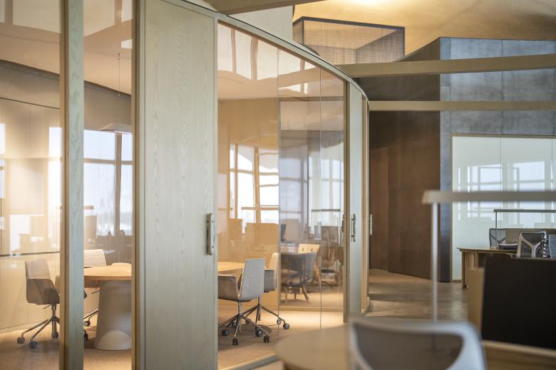 Executive areas use switchable glass glazing for the glass partitions, transparent or opaque based on requirements. The usage of super-thin LED light strings designed by Davide Groppi, spanning up to 17 meters, allowed illumination of areas where recess lights in walls, floors or ceilings was impossible.