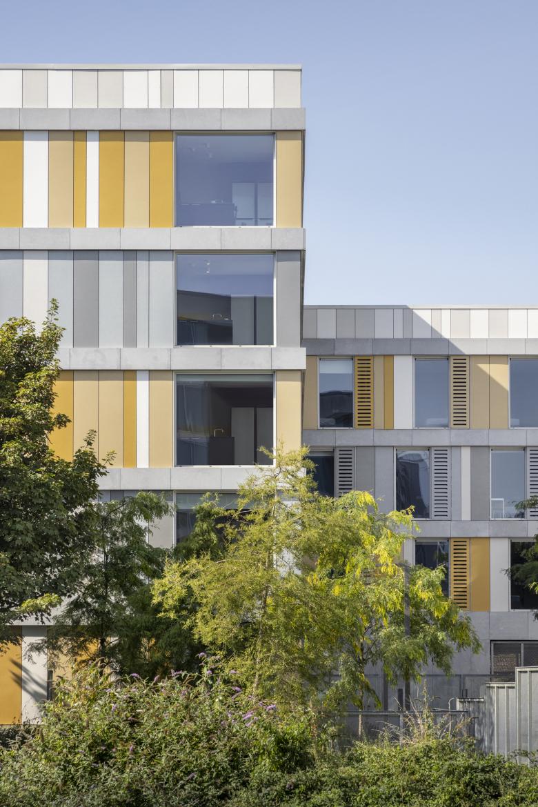 Zwischen den Granitbändern wechseln sich in vertikaler Abfolge Aluminiumfenster und geschosshohe Swisspearl-Faserzementplatten in Ocker- und Grautönen ab – als Teil einer vorgehängten hinterlüfteten Fassadenkonstruktion. Eine Palette von sechs Farben, die sich in wechselnden Farbgruppen über jede Fassade erstreckt, sorgt für eine einheitliche Gesamtkomposition und reduziert gleichzeitig optisch die Größe des Gebäudes. Die Fenster zur Belüftung sind hinter gefrästen Faserzementplatten untergebracht und so z. B. vor Einbruchversuchen geschützt.