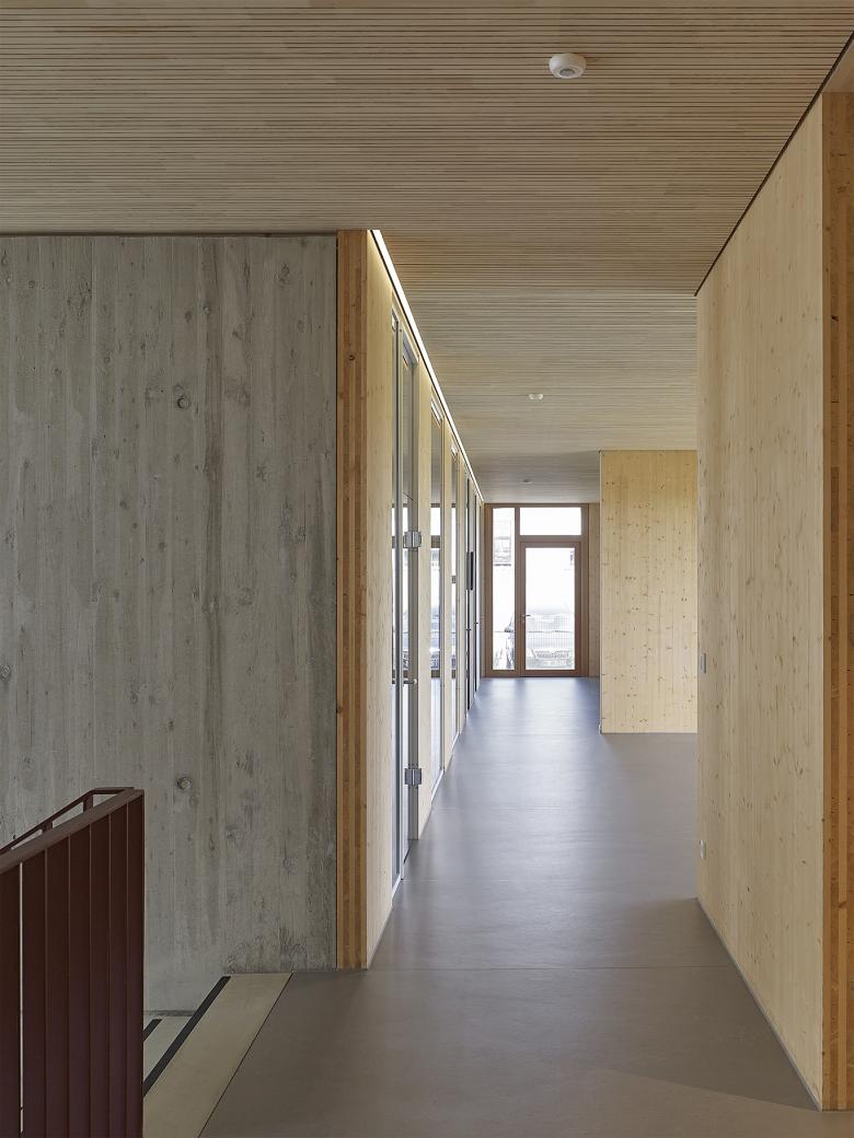Holz als wesentlicher Baustoff bestimmt die Erscheinung sowohl im Äußeren wie auch im Inneren des Gebäudes. Die tragenden Bauteile wurden aus Massivholzwandelementen und aus Lignatur Hohlkörperdecken erstellt. Die bewitterten Fassadenflächen aus Lärchenholz erhielten einen dunkleren Lasuranstrich, die wettergeschützten Bereiche sowie alle Holzflächen im Inneren bleiben unbehandelt und erhalten damit ihren naturbelassenen Ausdruck. Die Wand- und Dachelemente wurden vorgefertigt und oberflächenfertig angeliefert und in sehr kurzer Zeit auf der Stahlbetondecke des Sockelgeschoßes montiert. Holzfenster ergänzen dieses nachhaltige Gebäudekonzept. Auch die Haustechnik orientiert sich daran – Fußbodenheizung, dezentrale Lüftungsgeräte mit Wärmerückgewinnung und eine Photovoltaik-Anlage über die gesamte Dachfläche sowie eine Wärmepumpe sind die Bestandteile einer energiesparenden Gebäudetechnik.