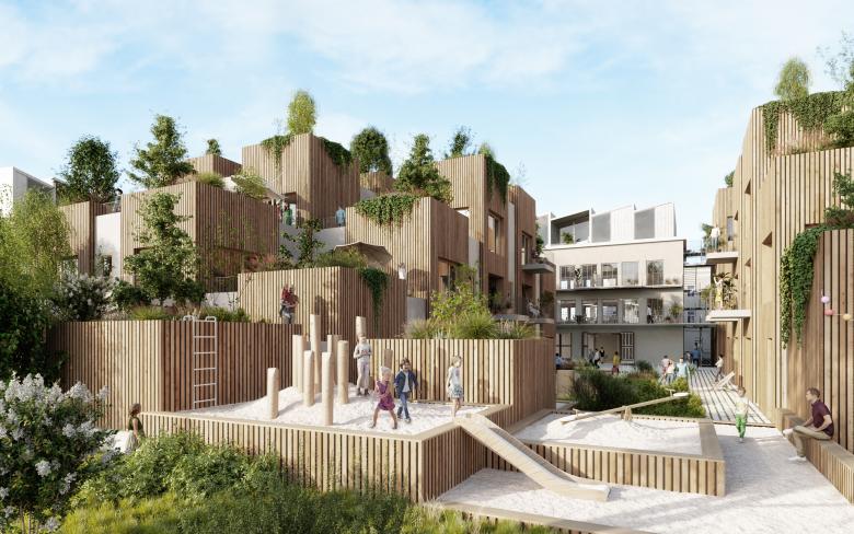 Instead of a closed-off block, the new volumes are arranged to create lively passageways and alleys. In stark contrast to its current function, the future Autopalast will be car-free yet still permeable to the public. The new buildings act as connectors, weaving the site into its surroundings. With terraced, pixel-like structures and planted roofs that extend the adjacent green space, the courtyard becomes part of a larger urban park. What was once entirely paved over will now provide greenery and ecological value for residents and neighbors alike.
