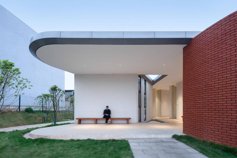 The shipping command center adopts a three-section layout and is spliced horizontally. Various tiny concave spaces are formed on the original regular box. The facade material is made of red bricks and white walls, which are staggered and spliced, giving each angle a different texture and Spatial changes.