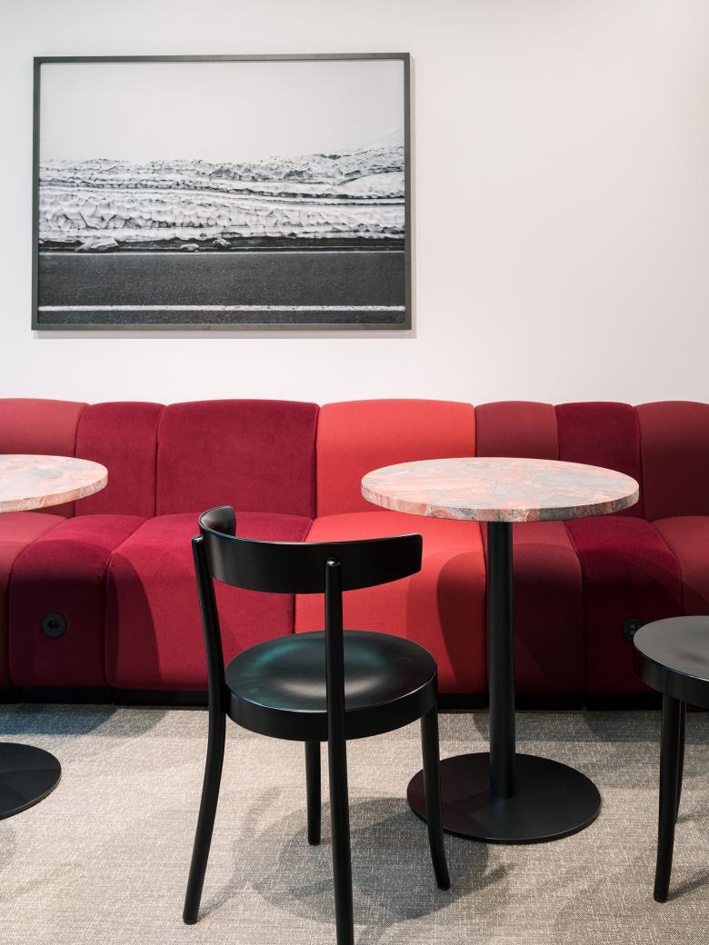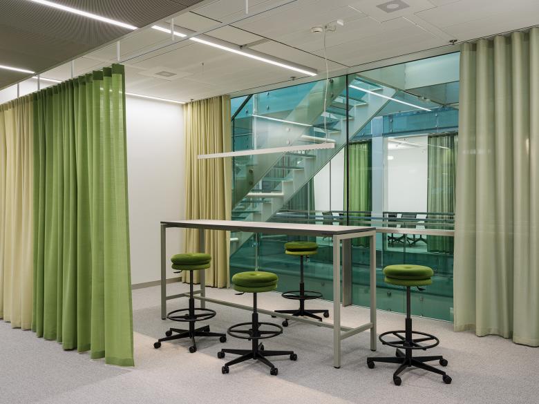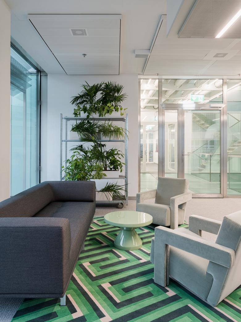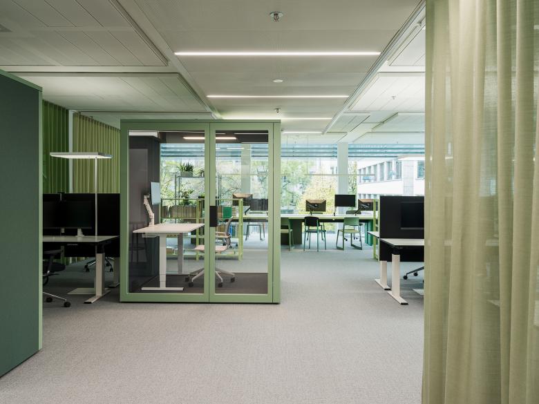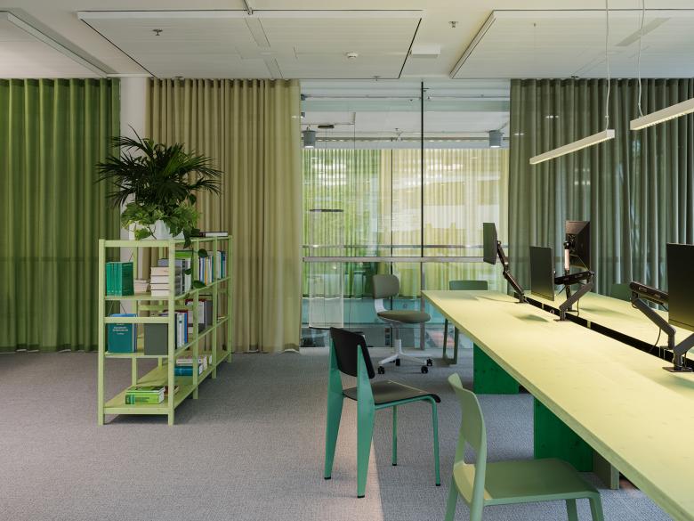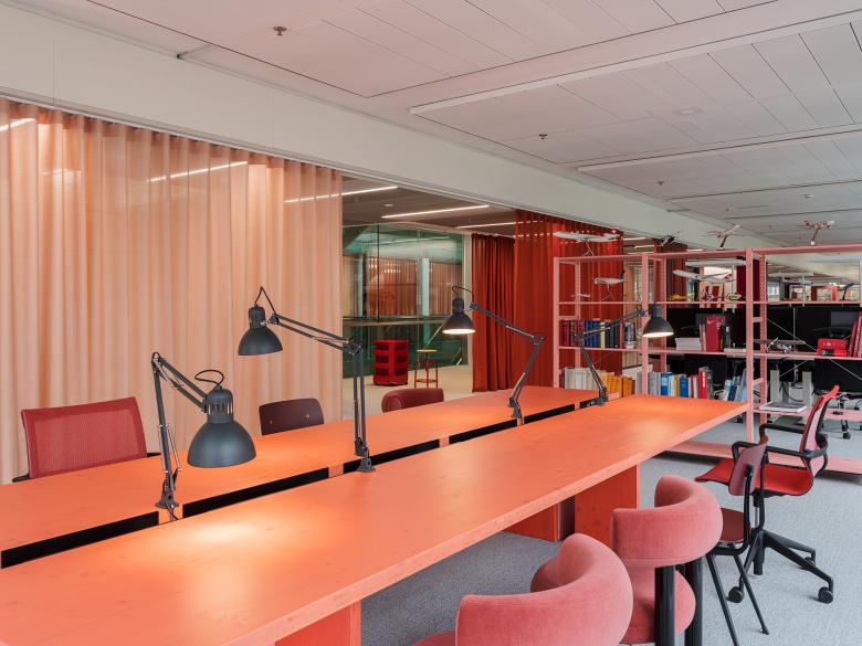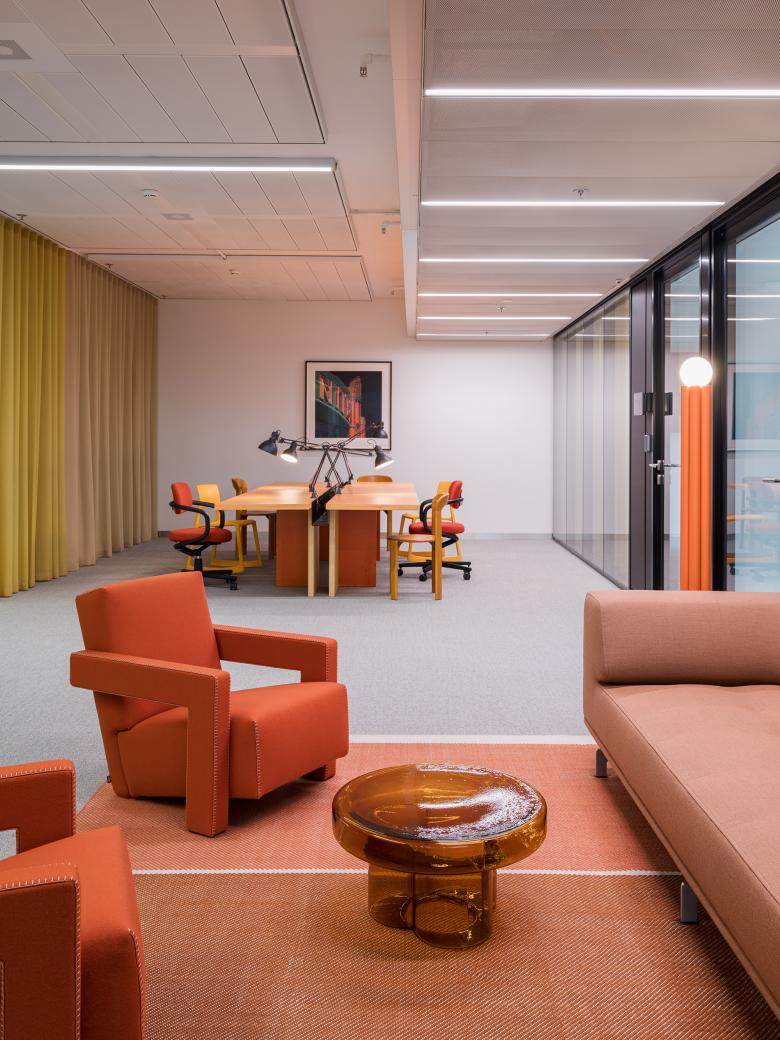 Im Grundausbau wurde ein Farbkonzept entwickelt, das mit Vorhängen arbeitet, um jedes Stockwerk in einer eigenen Farbe zu gestalten. Diese Vorhänge sorgen nicht nur für die nötige Privatsphäre, sondern filtern auch das Licht und schaffen eine diskrete Atmosphäre in den Bereichen, die zum öffentlichen Atrium des Gebäudes hin geöffnet sind. Aufbauend auf diesem Konzept hat dopo alternative Arbeitszonen entwickelt und die Standardarbeitsplätze mit eigenen Bereichen in Orange, Grün und Rot ergänzt. Lounges, Besprechungsräume, Workshop-Zonen und eigens für dieses Projekt gestaltete Touchdown-Tische fördern das flexible Arbeiten und den kreativen Austausch der Mitarbeitenden.