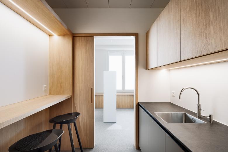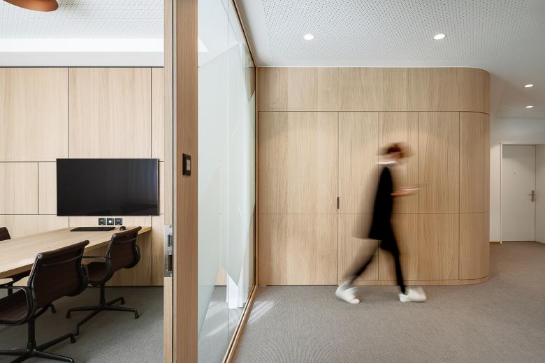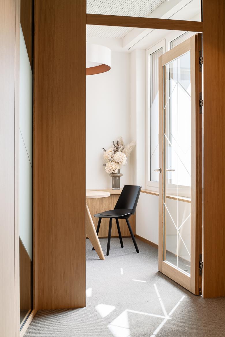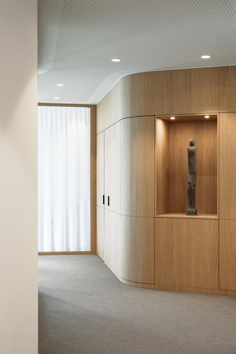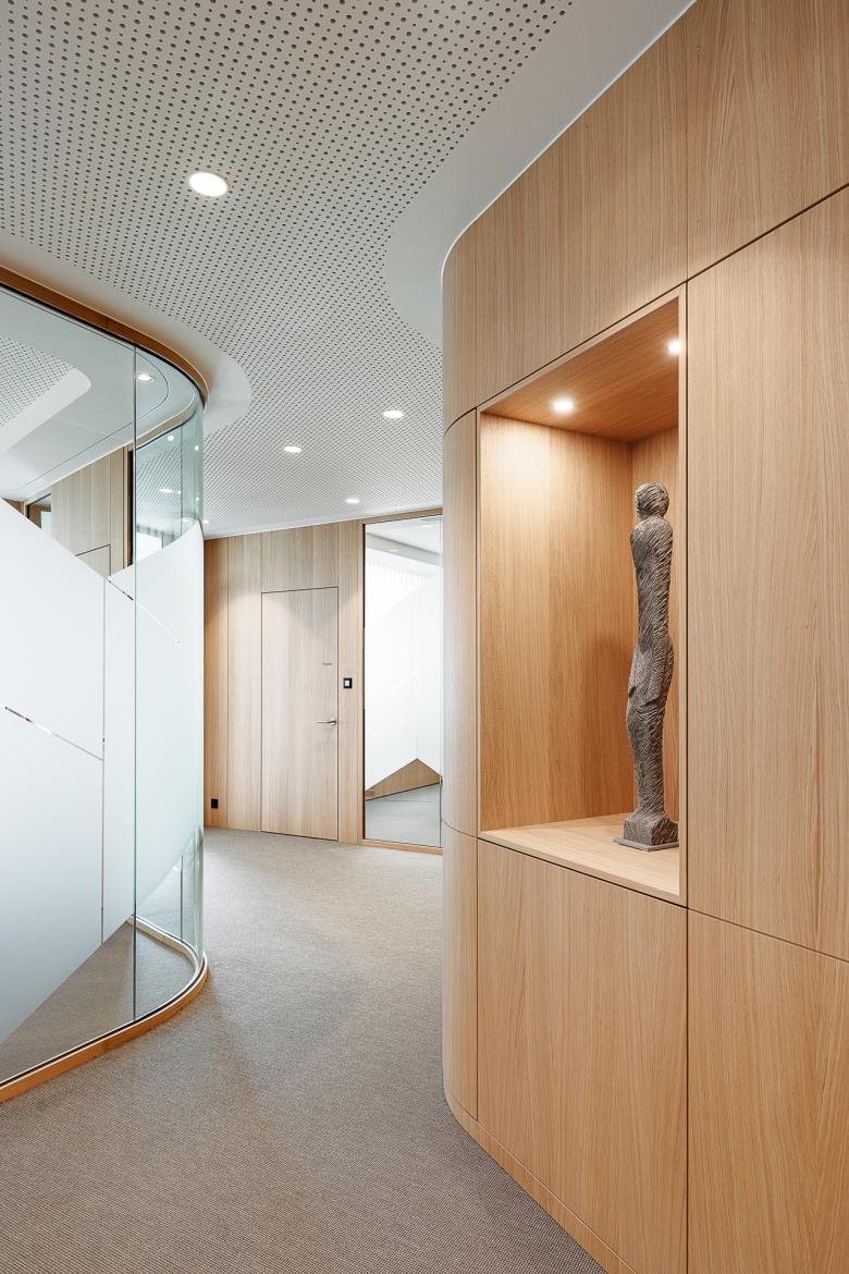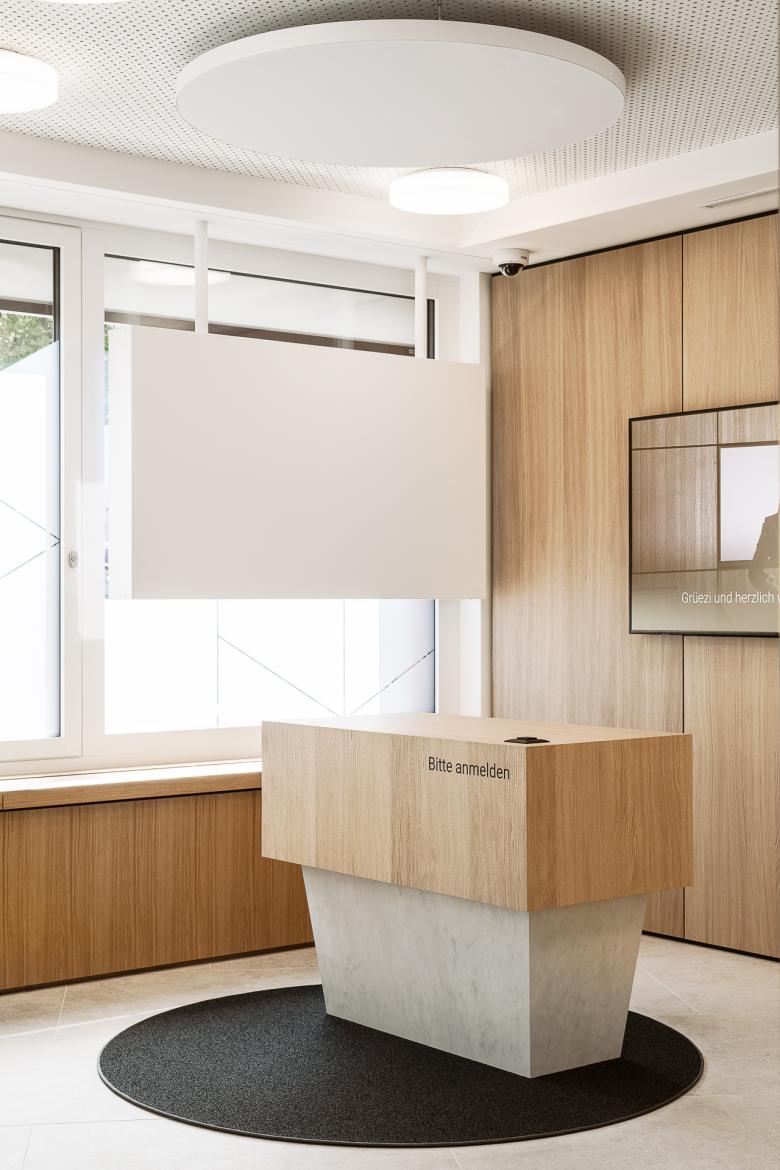 In der neuen acrevis Niederlassung in Lachen SZ vereinen sich helle Materialien, dynamische Formen und durchdachte Funktionalität zu einem Raumkonzept, das Vertrauen schafft. Mit der Überzeugung, dass eine Bank heute mehr als nur ein abgesicherter Tresor sein sollte, wurde eine einladende Atmosphäre geschaffen, die Offenheit und Modernität ausstrahlt. Die ungewöhnliche Dreiecksform des Gebäudes stellte eine gleichzeitig Herausforderung und Chance dar, abseits klassischer Raumaufteilungen ein innovatives Konzept zu realisieren. Der Eingang an der Spitze der Nordseite führt Besucher direkt in die 24-Stunden-Zone mit dem Bancomaten. Hier setzt eine Wandverkleidung aus bronzefarbenem Aluminiumblech mit hexagonalen Mustern markante Akzente, die an die Prinzipien von Fleiß und Präzision erinnern – Werte, die auch eine Bank verkörpert. Die Formensprache und Materialwahl, wie der Boden aus istrischem Kalkstein, wurden bewusst gewählt, um eine Verbindung zur Gestaltung des Hauptsitzes in St. Gallen zu schaffen. Dies unterstreicht die konsistente Ästhetik und Identität der acrevis Bank über verschiedene Standorte hinweg.