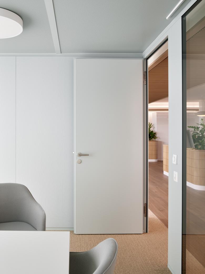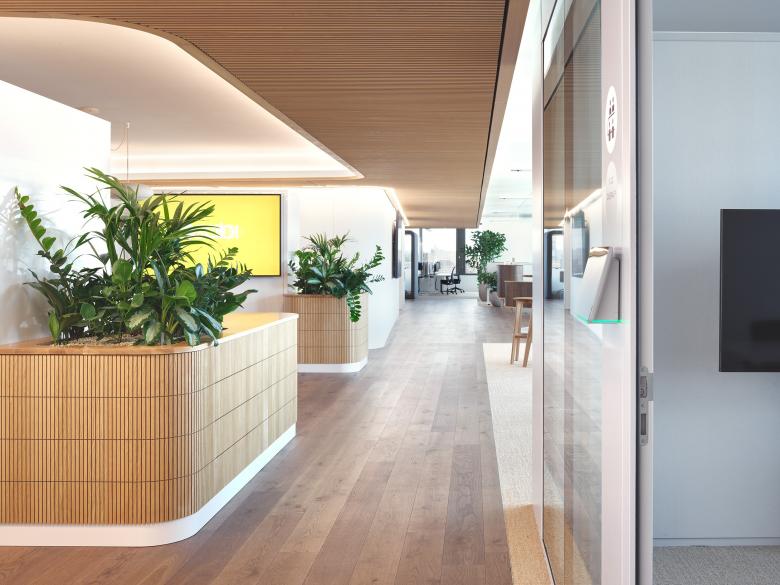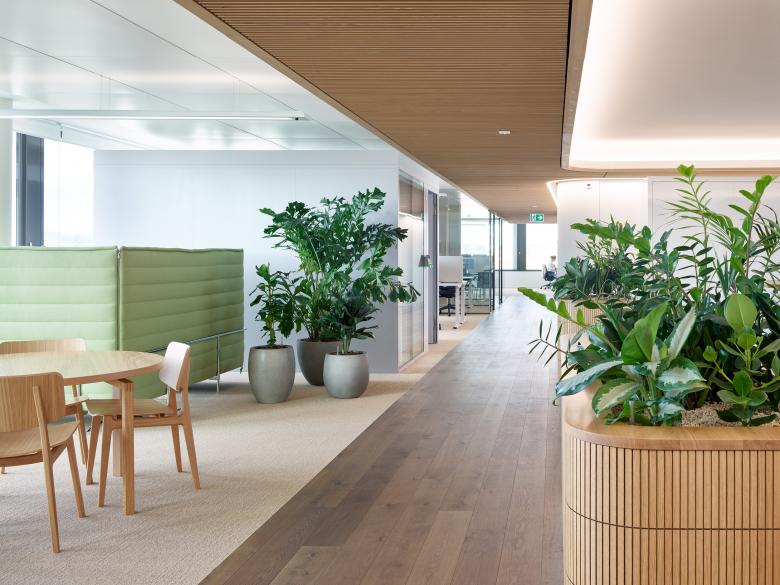 Auch die Material- und Farbwahl folgt diesem Ansatz. Helle, natürliche Oberflächen, eine zurückhaltende Farbpalette und gezielte Begrünung schaffen eine freundliche, ruhige Atmosphäre. Die Gestaltung tritt nicht in den Vordergrund, sondern schafft einen Rahmen, in dem sich Menschen wohlfühlen und produktiv arbeiten können.