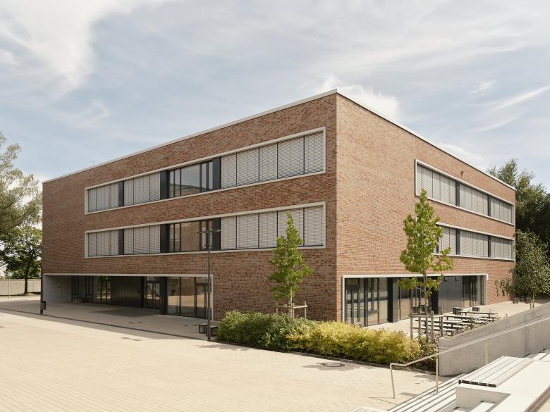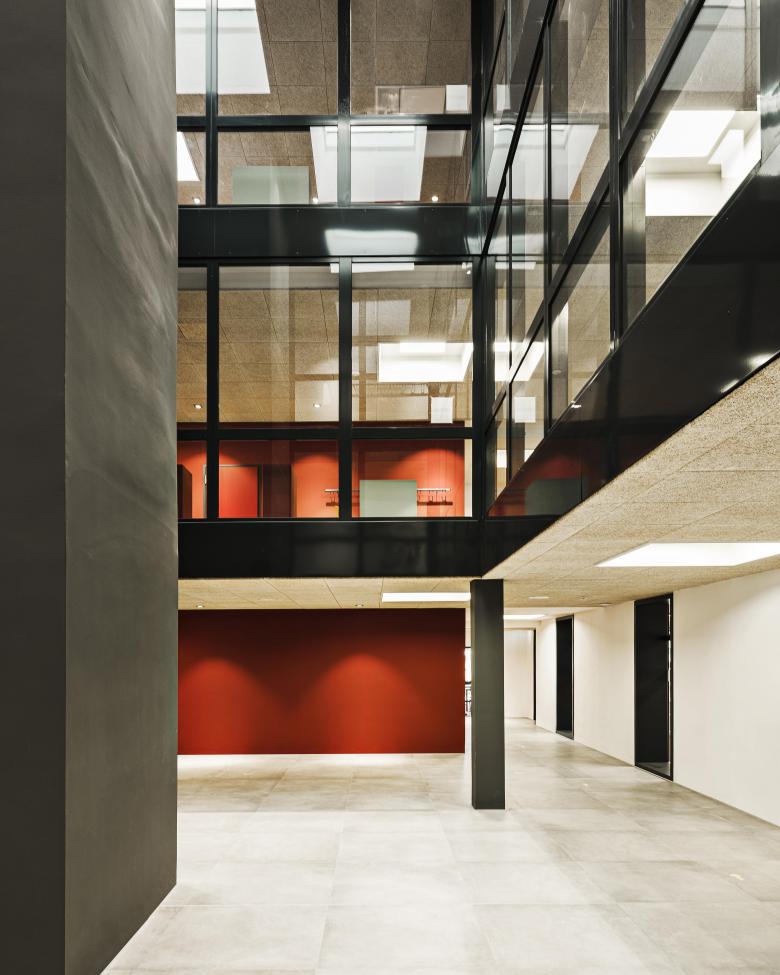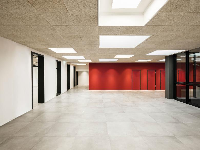 Der Grundriss zeichnet sich durch eine einfache und klare innere Strukturierung aus. Entlang des zentralen Foyers sind mit Selbstlernzentrum, Bibliothek und Informatikraum die Ganztagsflächen angeordnet. Die Erschließung der Obergeschosse erfolgt über zwei neue Treppenhäuser. Die bestehende zentral gelegene Treppe wird abgebrochen, doch zur Verbesserung der natürlichen Belichtung und der visuellen Kommunikation bleibt das Treppenloch als Atrium/Luftraum erhalten.