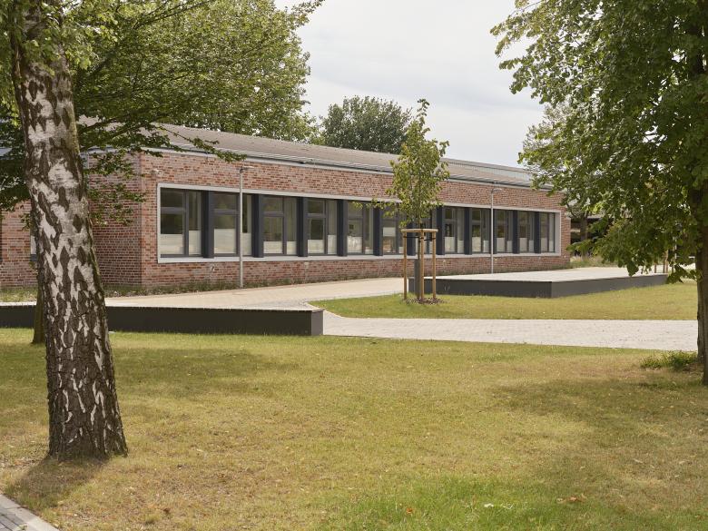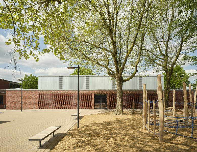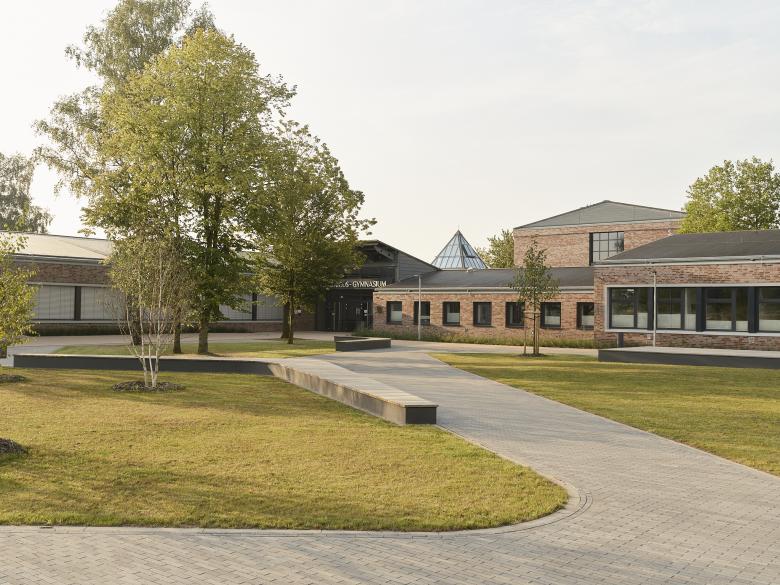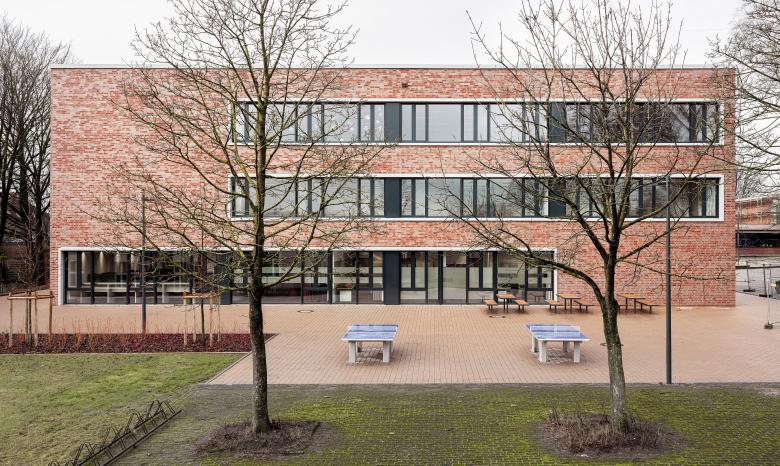 Zentraler Bestandteil der Entwurfsidee ist die Integration des Pilzgebäudes in das Gebäudeensemble des Copernicus-Gymnasiums und die Schaffung eines einheitlichen Erscheinungsbildes. Dies wird zum einen durch die homogene Fassadengestaltung aus rotem Klinker erreicht, wie auch durch die Nutzung der Flächen unterhalb der auskragenden Gebäudeteile des Pilzgebäudes, wodurch ein kompakter dreigeschossiger Baukörper entsteht. Die Erschließung des Pilzgebäudes erfolgt über den Schulhof.