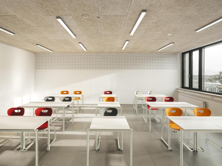 Die beiden Obergeschosse sind annähernd baugleich strukturiert. Jede Ebene verfügt über einen inneren Kern mit Toiletten, Putzmittelraum und Technik/ Server und außen liegenden Klassenräumen. Zahlreiche Öffnungen im Dach bringen reichlich Tageslicht in das Innere des Gebäudes und führen zu einer deutlichen Verbesserung der Aufenthaltsqualität der zentralen Bereiche.