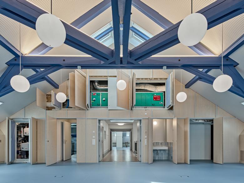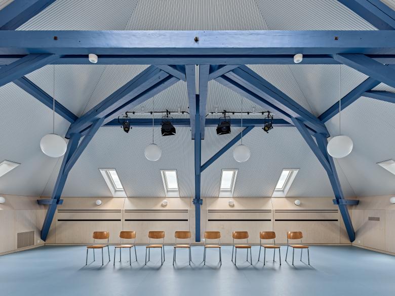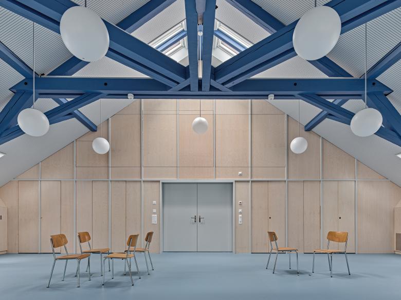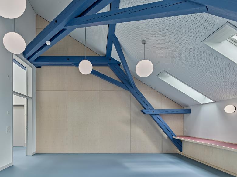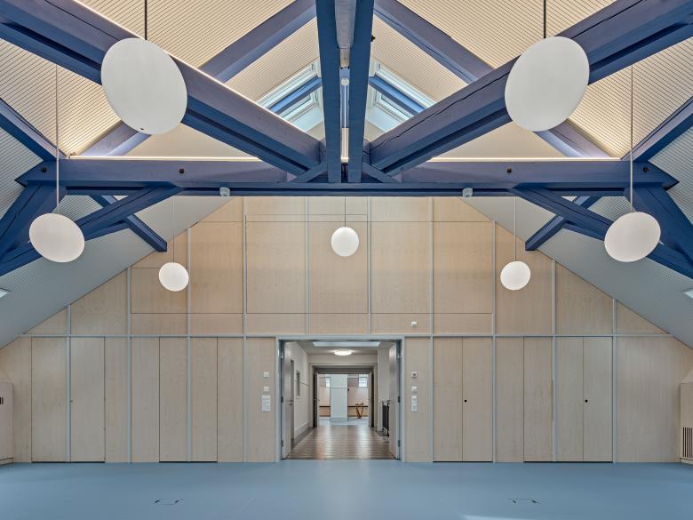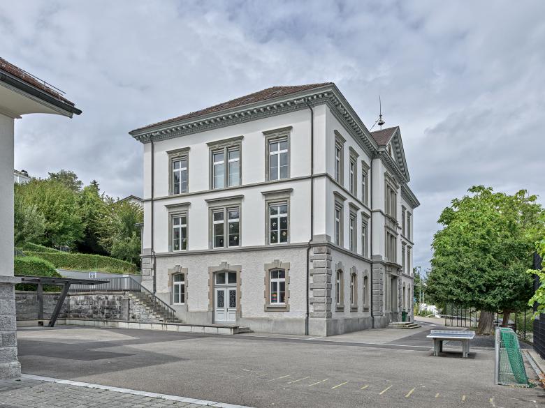 Das Dorfschulhaus in Kilchberg aus dem 19. Jahrhundert bildet zusammen mit der Alten Kanzlei ein historisches Ensemble nahe beim Bahnhof und dient seit jeher als Primarschulhaus. Am Hang über dem Zürisee gelegen verfügen alle Klassenzimmer über einen zweiseitigen Seeblick. In enger Zusammenarbeit mit der Denkmalpflege wurde der Schulraum im Bestand erweitert: Im Erdgeschoss entstand ein neues Klassenzimmer und das bisher kalte Dachgeschoss wurde zu einem Mehrzweckraum für Veranstaltungen und Mittagstisch ausgebaut mit Bühnentechnik und angrenzender Küche. Ebenfalls entstanden Musik- und Lagerräume sowie eine Lüftungsanlage auf dem Dachboden, versteckt hinter der Wandverkleidung. Das geschützte Uhrwerk wurde erhalten und durch ein Schaufenster im Treppenhaus sichtbar gemacht. Durch bauliche Massnahmen wurden die radonbelasteten Räume im Erdgeschoss saniert und energetisch verbessert und die bestehende Gasheizung durch eine erdsondenbetriebene Wärmepumpe ersetzt, die auch die Freecooling-Konvektoren im Dach betreibt.