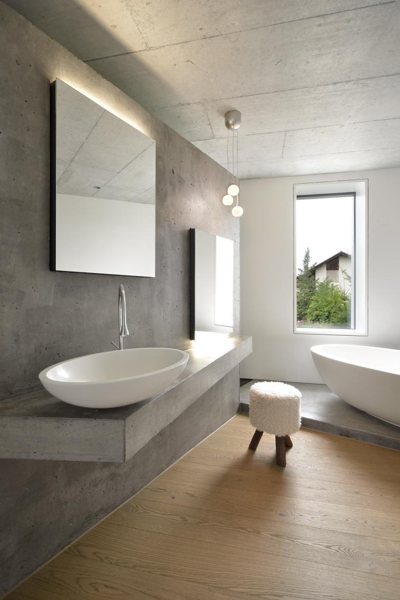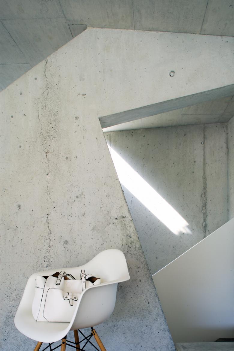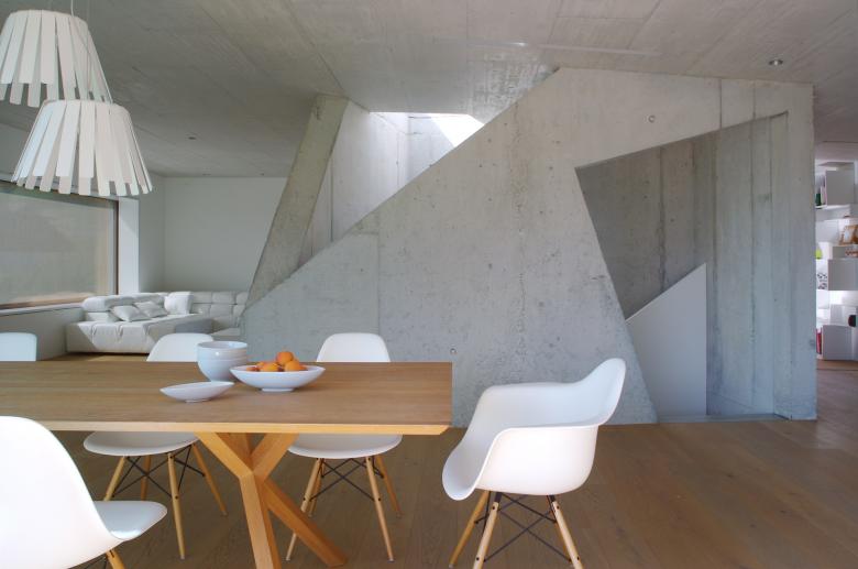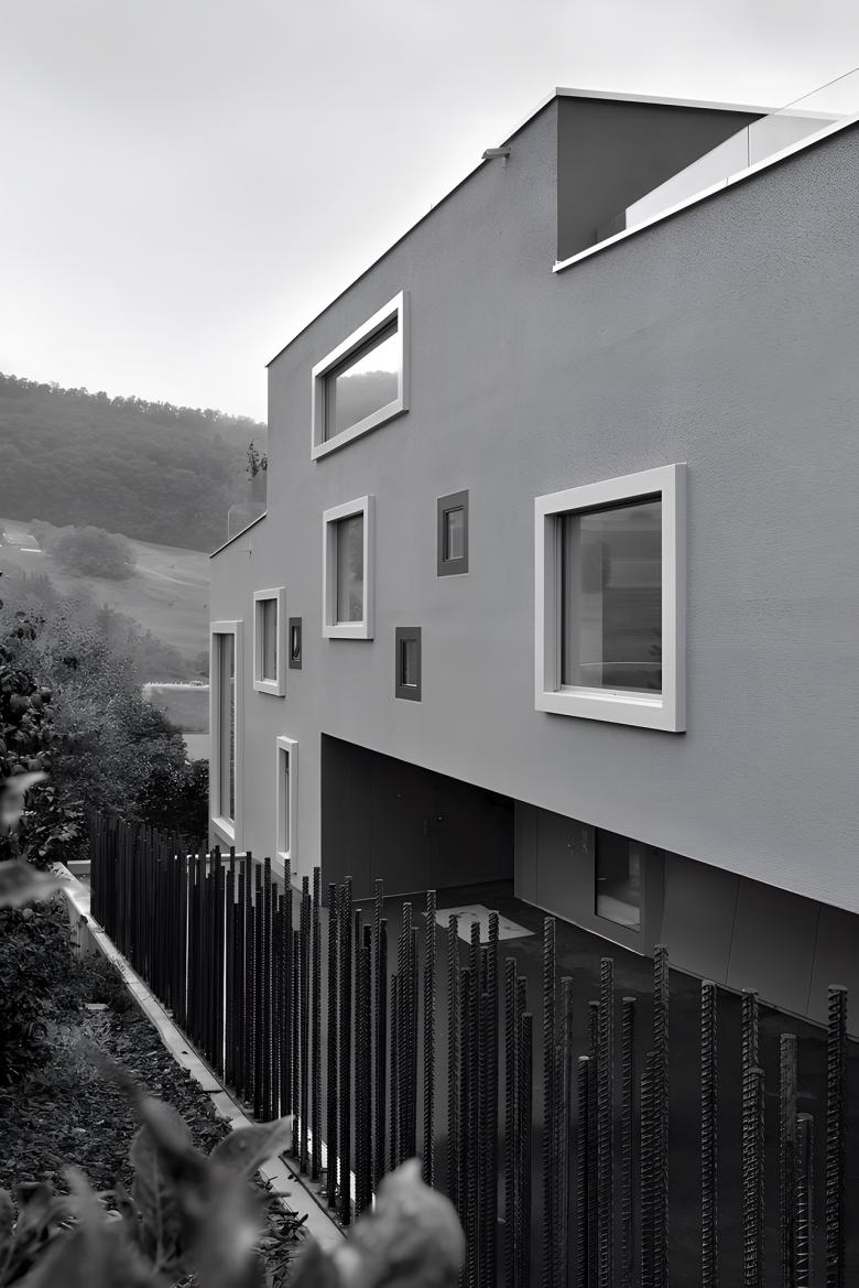 Das Doppelhaus mit seiner unkonventionellen Raumstruktur basiert auf einem Parallelogramm-Grundriss und überzeugt durch eine skulpturale, beschnittene Kubatur. Die unterschiedlich strukturierten und farbigen Putzflächen sowie die kastenförmigen Fenster verleihen dem Gebäude einen verspielten, individuellen Charakter. Vier prägnante Einschnitte gliedern den Baukörper und erfüllen praktische Anforderungen, wie die Zufahrt im Norden und den Durchgang zum gemeinsamen Garten. Innen wurden zwei kontrastierende Wohnkonzepte umgesetzt: Während die talseitige Einheit mit einer geschwungenen Treppe entlang der Trennwand beeindruckt, organisiert sich die Hangwohnung um einen dynamischen Treppenkern. Beide Konzepte verbinden funktionale Erschliessung mit einem spannenden Raumgefühl und bieten den Bewohnern jeweils individuelle Wohn- und Gemeinschaftsbereiche, die optimal auf ihre Bedürfnisse abgestimmt sind.