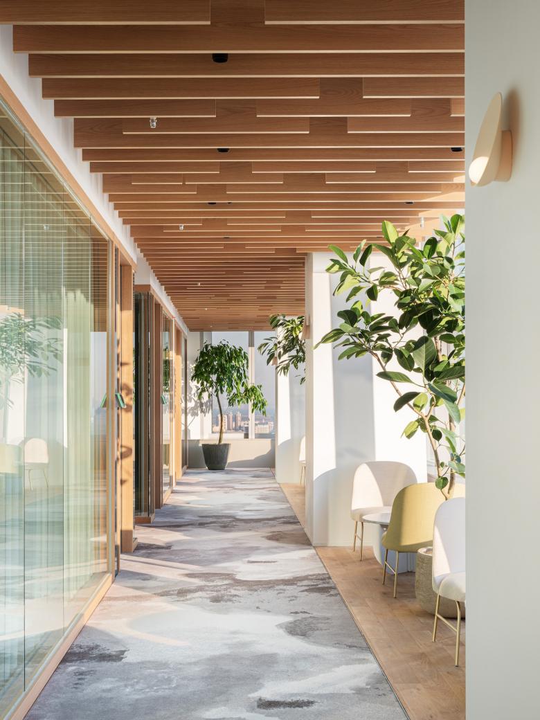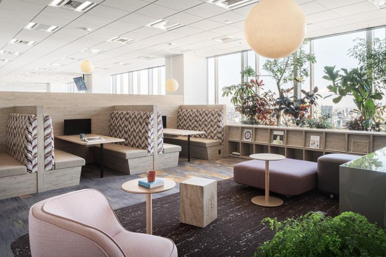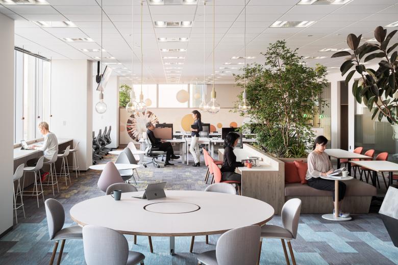 社員の健康とエンゲージメントの最大化を目指し、植物や自然光をふんだんに取り入れるバイオフィリックデザインの手法を採用して設計したオフィス。